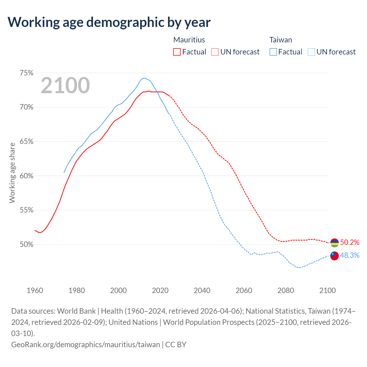 The share of older people aged 65 and over is 13.5% in Mauritius and 19.2% in Taiwan. Life expectancy in Mauritius compared to Taiwan .