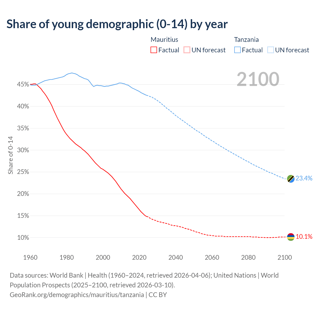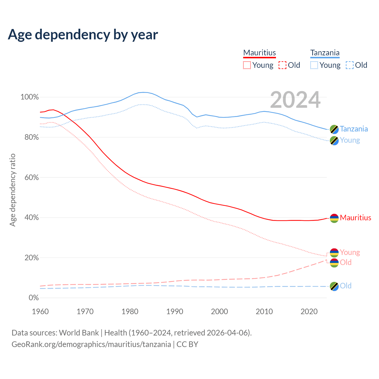 - Mauritius is ranked 57/196 by median age (oldest to youngest) vs 184/196 for Tanzania.