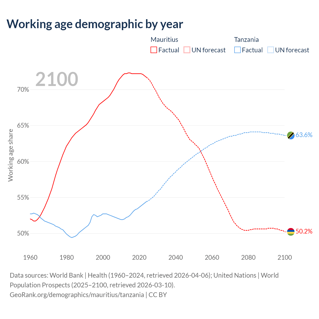 - Mauritius has 889K working age adults (aged 15-64) vs 39.8M in Tanzania.