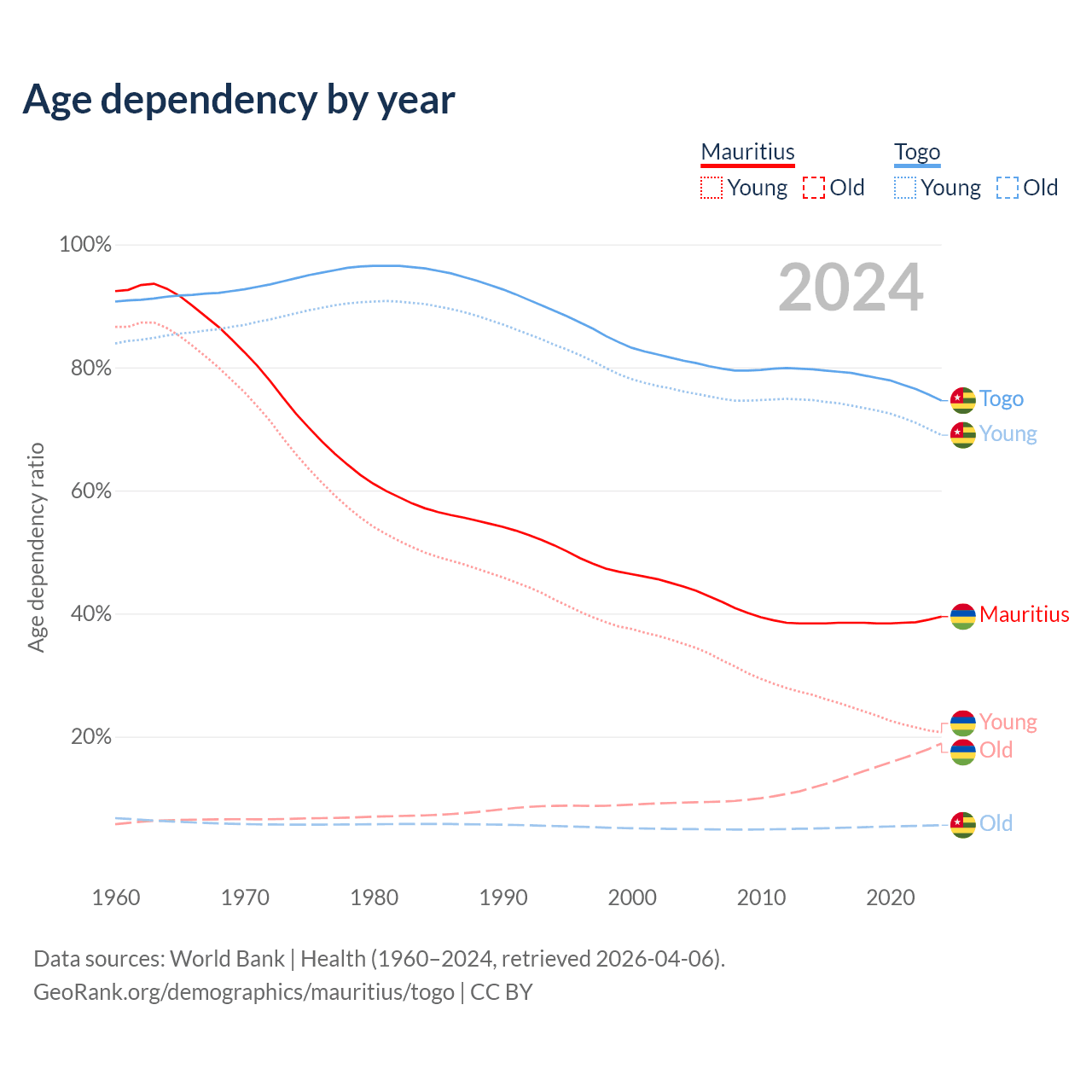 - Mauritius is ranked 57/196 by median age (oldest to youngest) vs 166/196 for Togo.