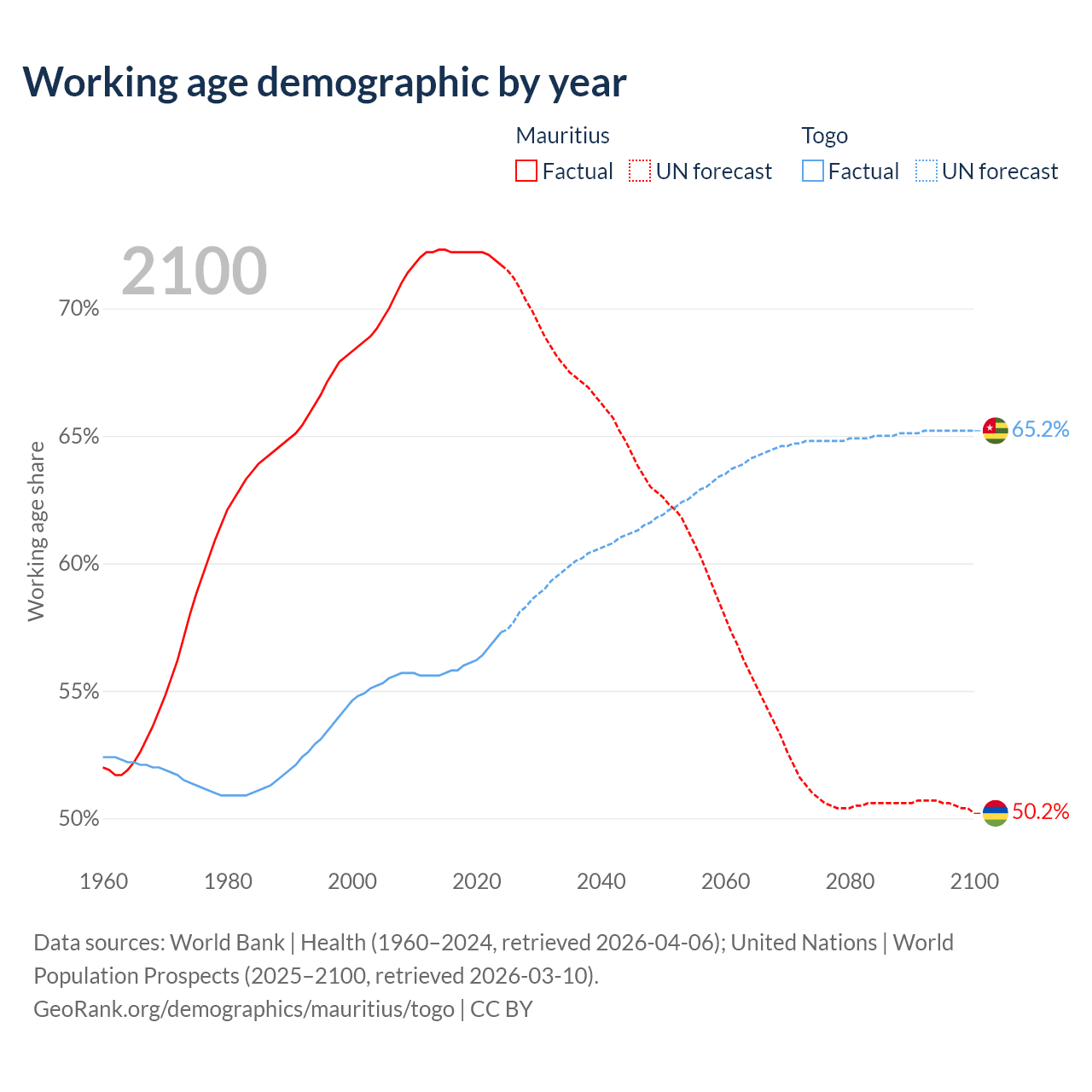 - Mauritius has 889K working age adults (aged 15-64) vs 5.72M in Togo.