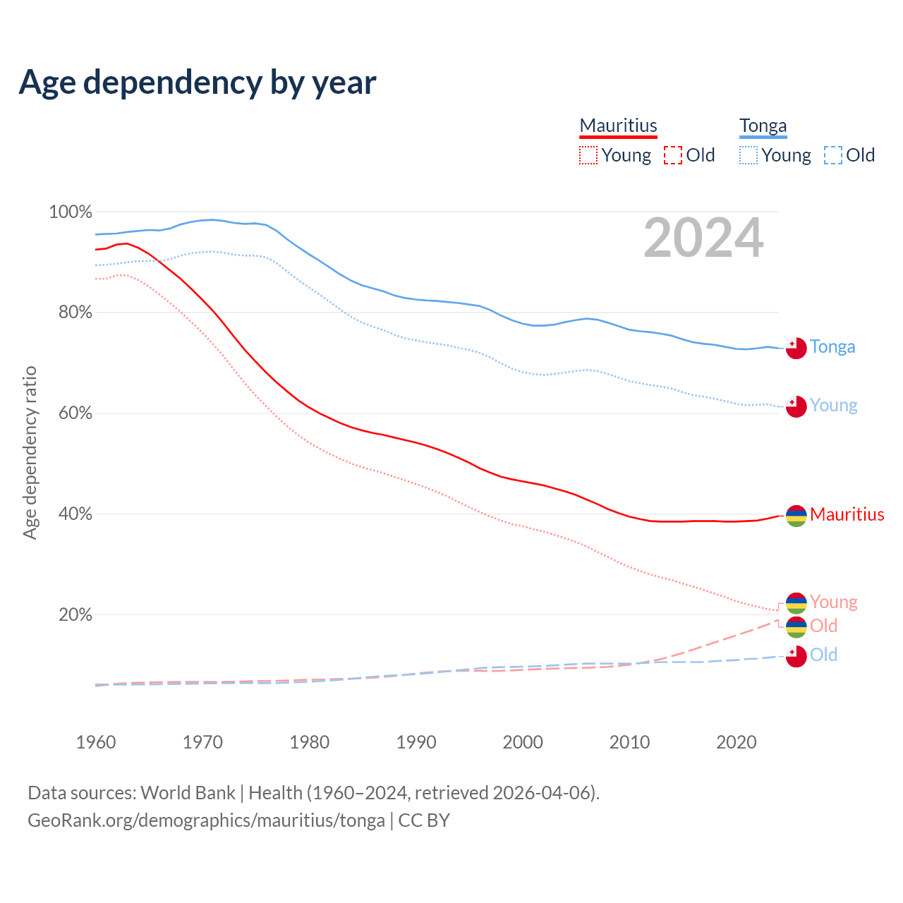 - Mauritius is ranked 57/196 by median age (oldest to youngest) vs 149/196 for Tonga.
