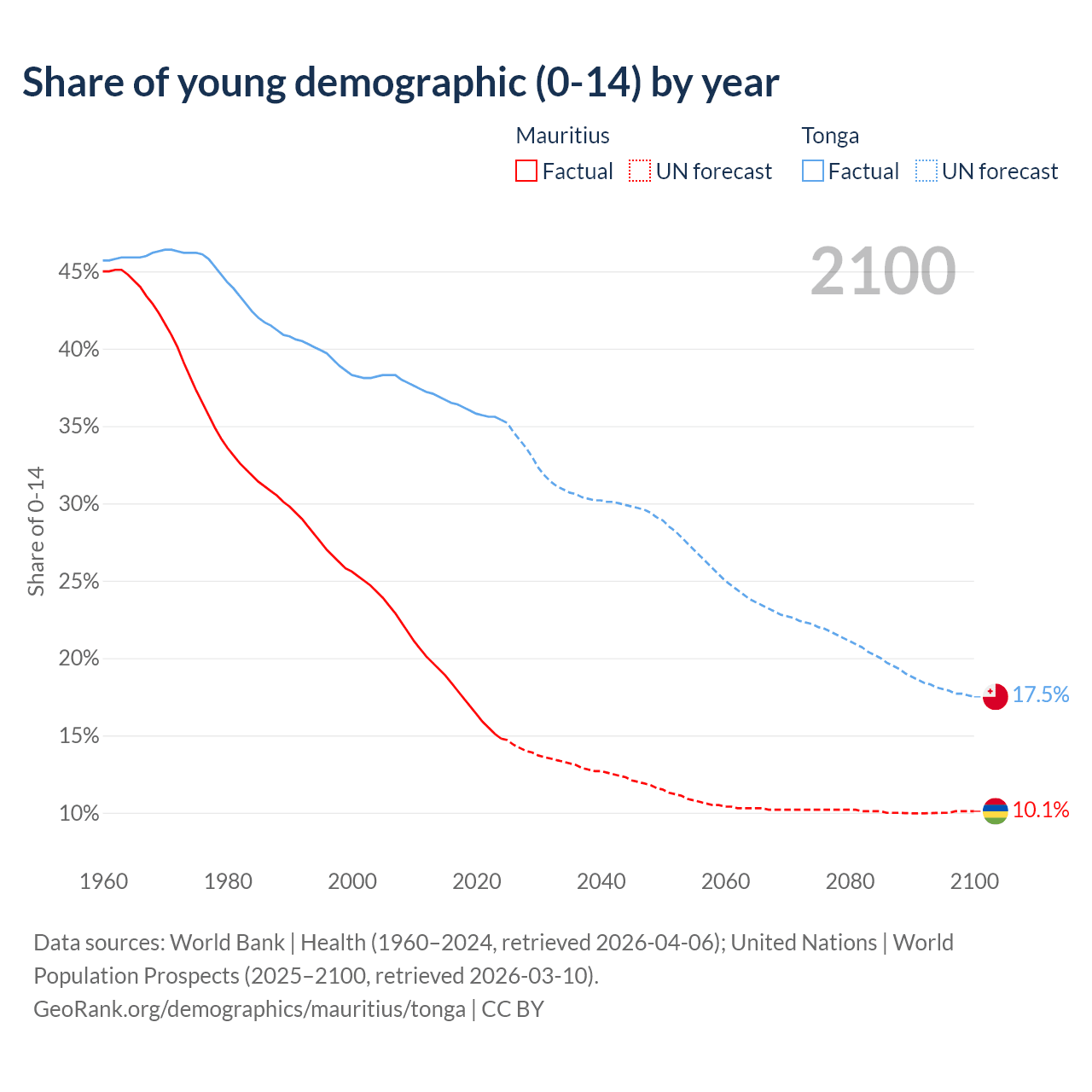 - As of 2026, the population of Mauritius is 1.24M vs 103K in Tonga - 12 times difference.
