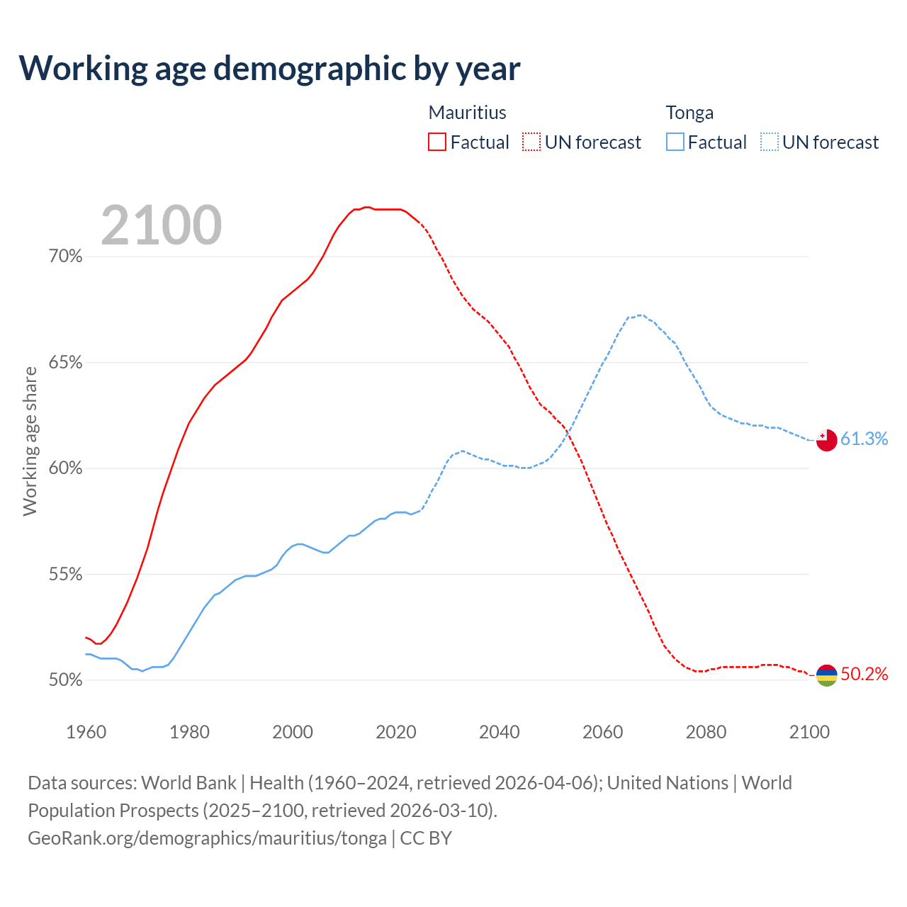 The share of older people aged 65 and over is 13.5% in Mauritius and 6.72% in Tonga. Life expectancy in Mauritius compared to Tonga .