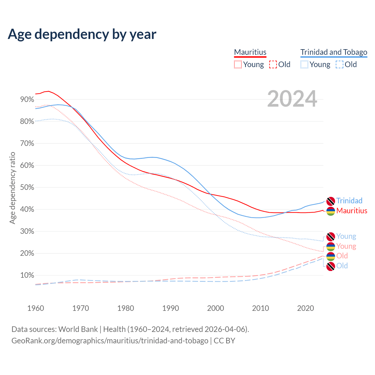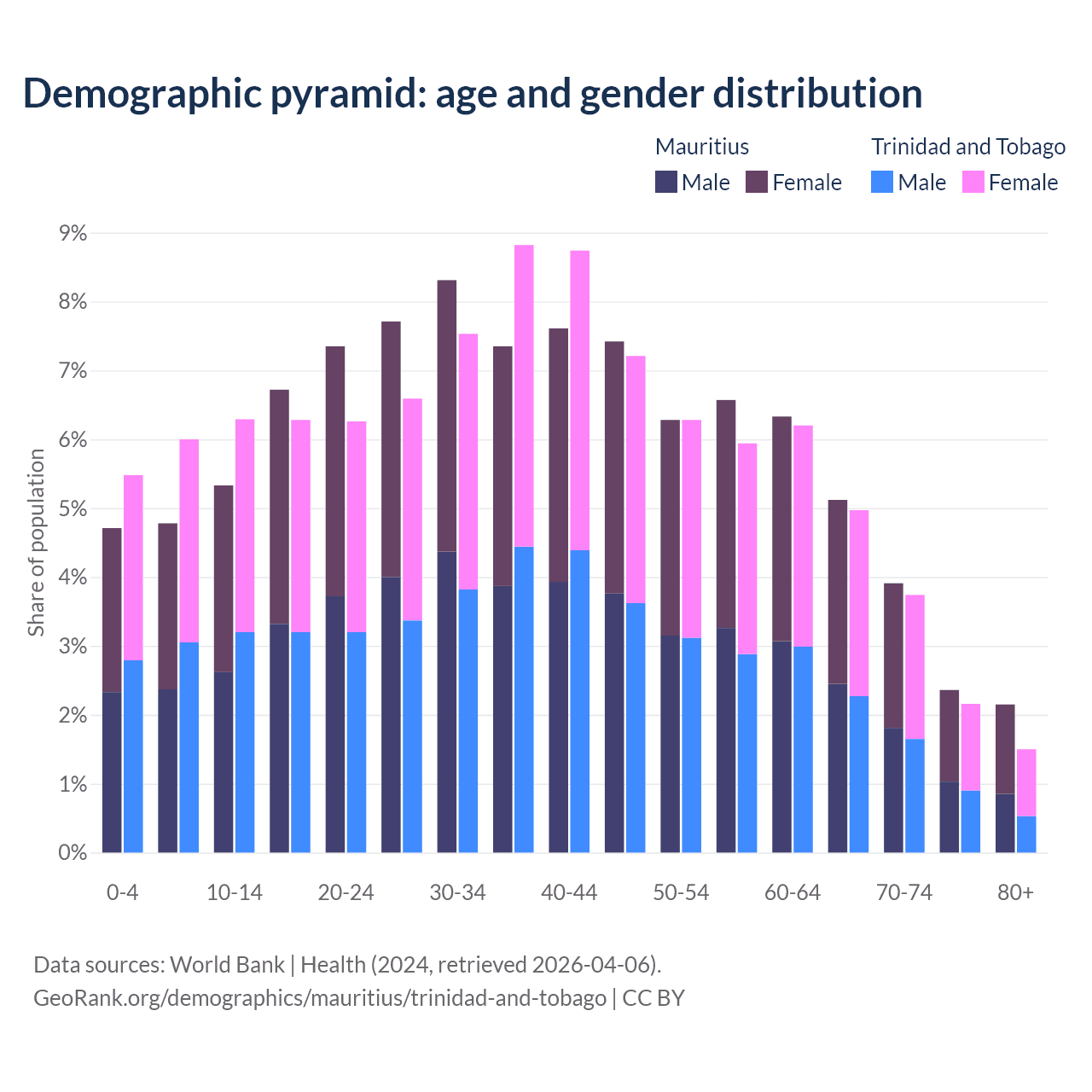 - Mauritius is ranked 57/196 by median age (oldest to youngest) vs 58/196 for Trinidad and Tobago.