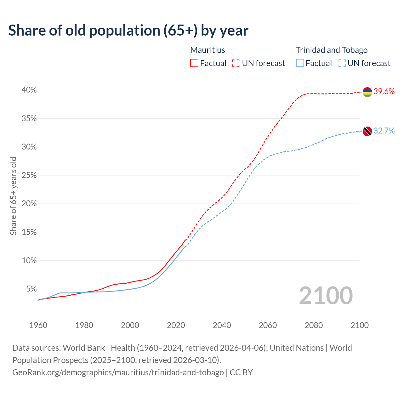 The share of older people aged 65 and over is 13.5% in Mauritius and 12.4% in Trinidad and Tobago. Life expectancy in Mauritius compared to Trinidad and Tobago .
