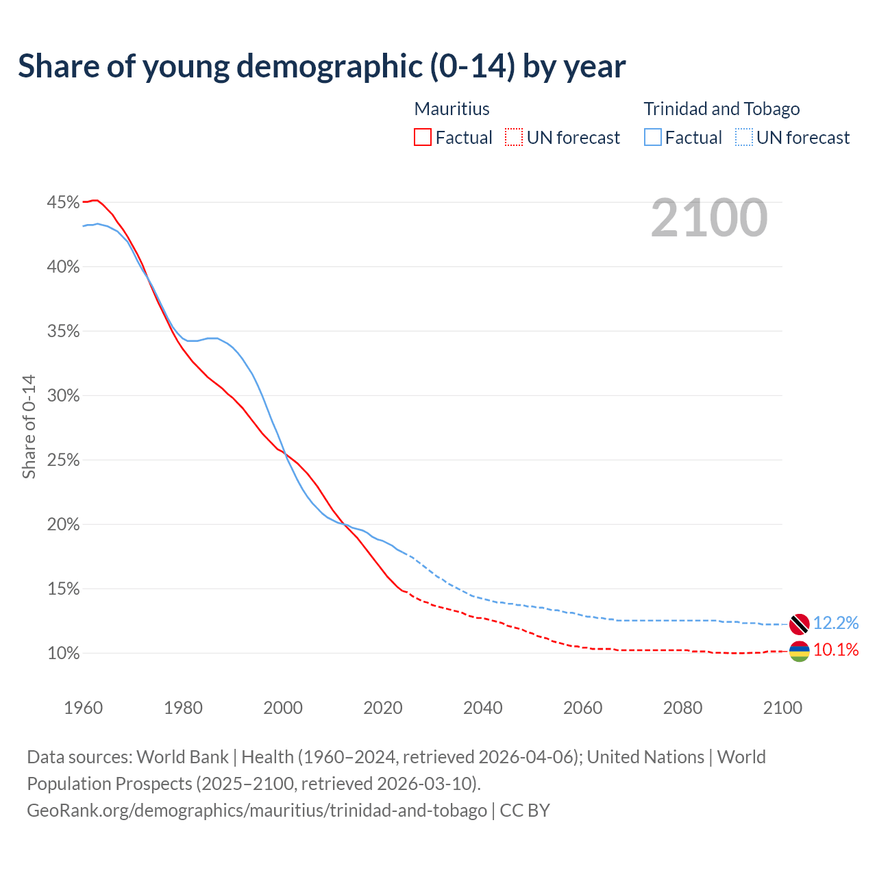 - The share of young demographic (0-15 years old) in Mauritius is 14.8% vs 17.8% in Trinidad and Tobago.