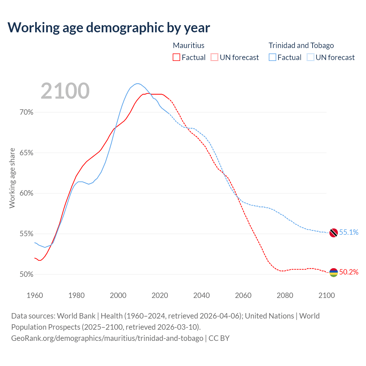 - Mauritius has 889K working age adults (aged 15-64) vs 960K in Trinidad and Tobago.