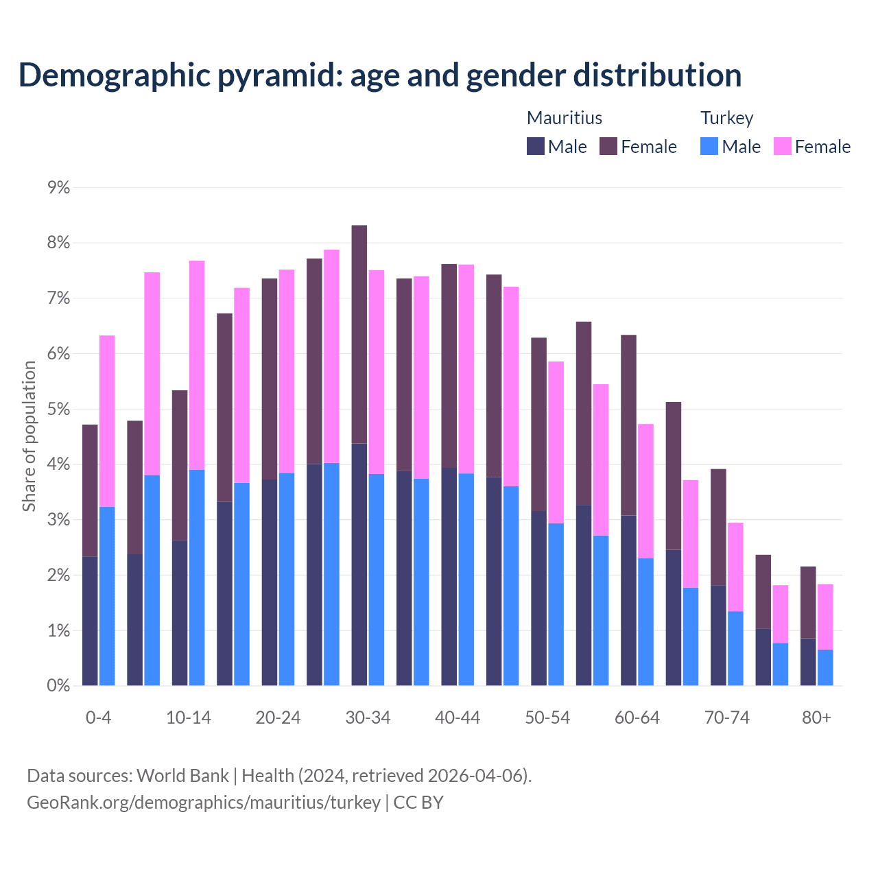 The share of older people aged 65 and over is 13.5% in Mauritius and 10.3% in Turkey. Life expectancy in Mauritius compared to Turkey .