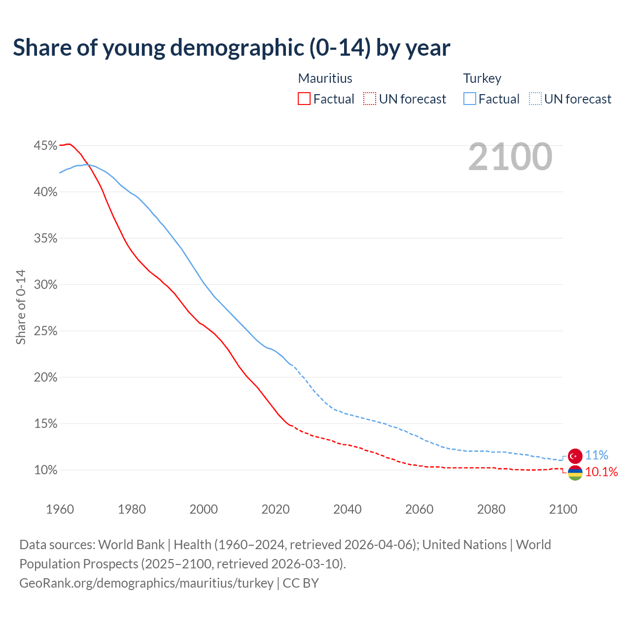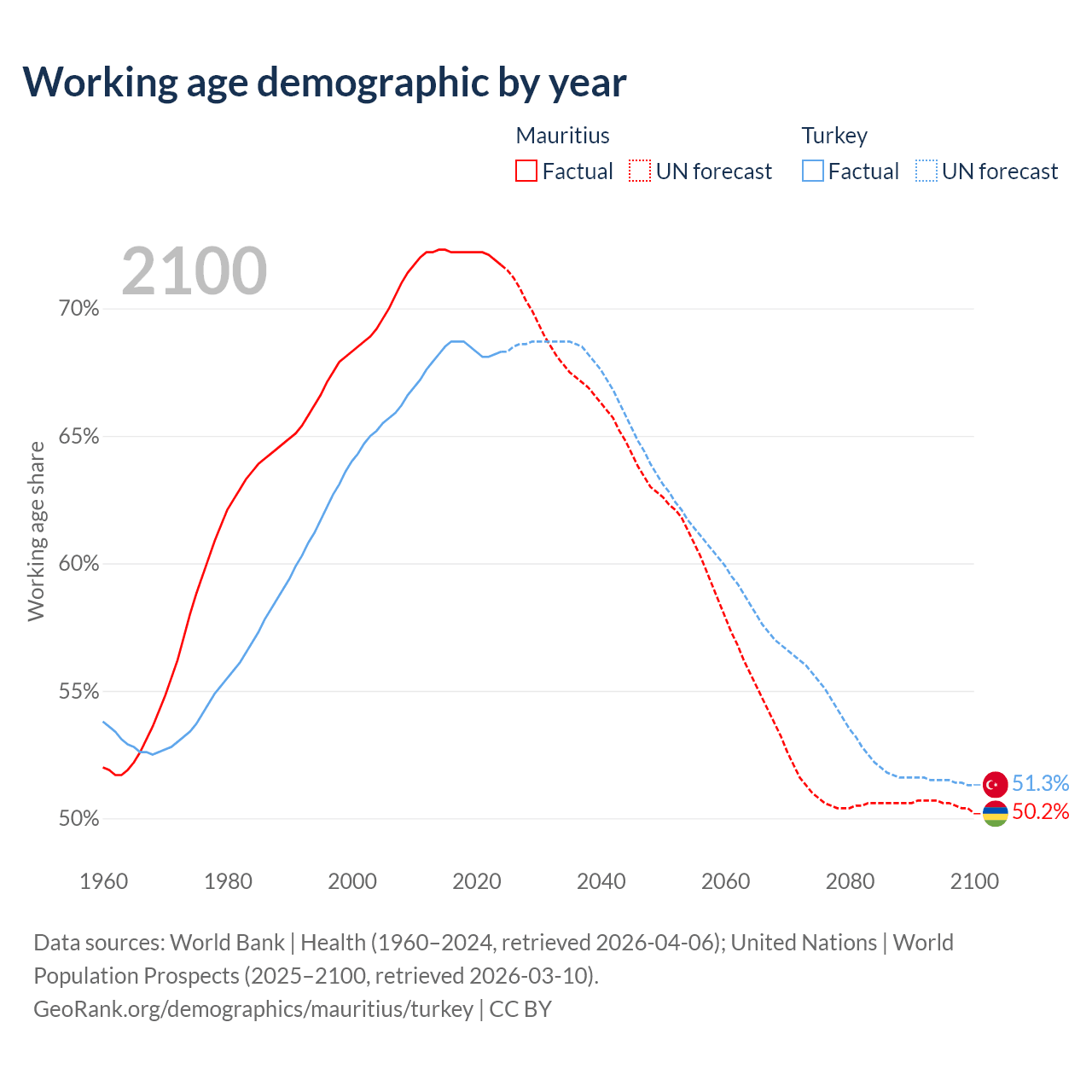 Median age Mauritius vs Turkey, 1960-2100