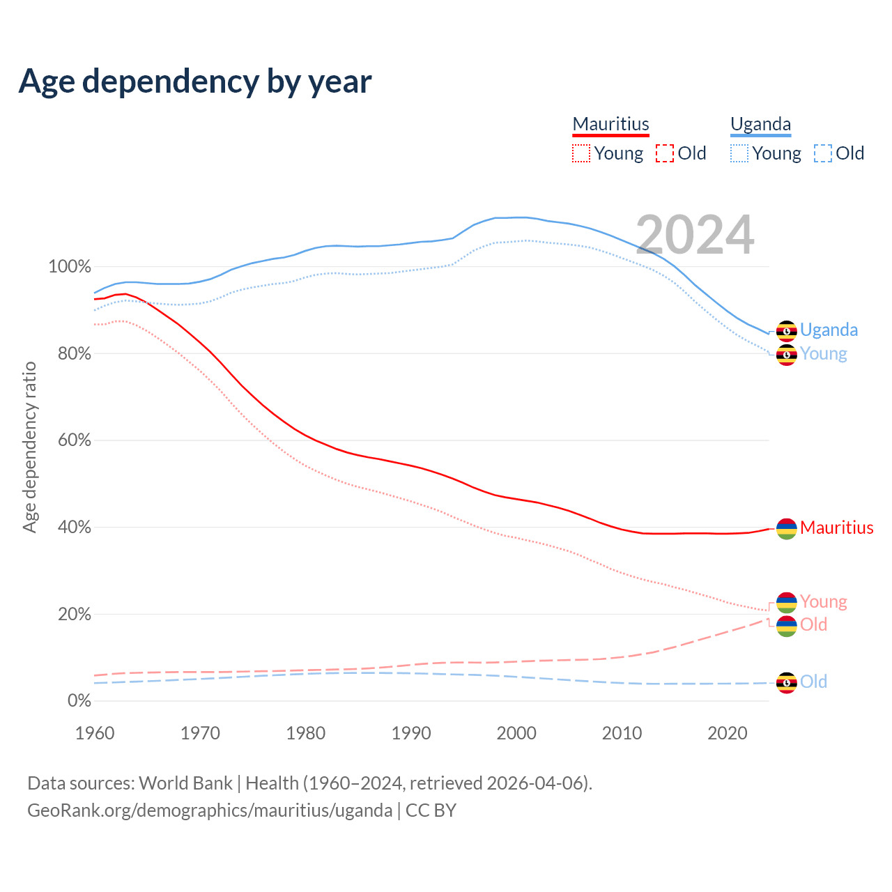 - Mauritius is ranked 57/196 by median age (oldest to youngest) vs 187/196 for Uganda.