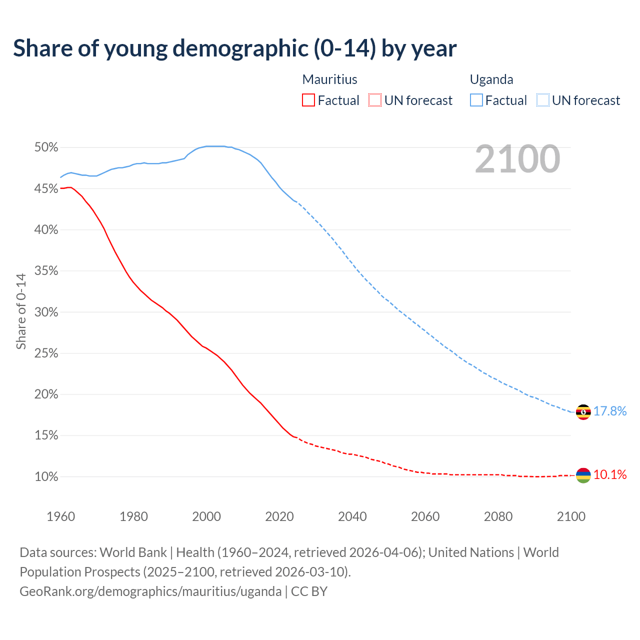 - The share of young demographic (0-15 years old) in Mauritius is 14.8% vs 43.5% in Uganda.