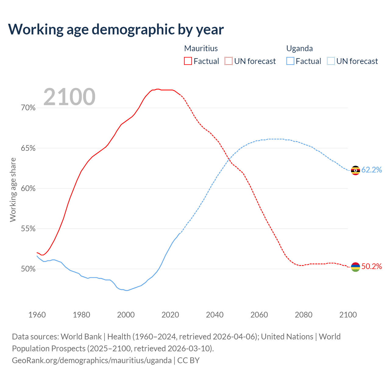 - Mauritius has 889K working age adults (aged 15-64) vs 28.9M in Uganda.