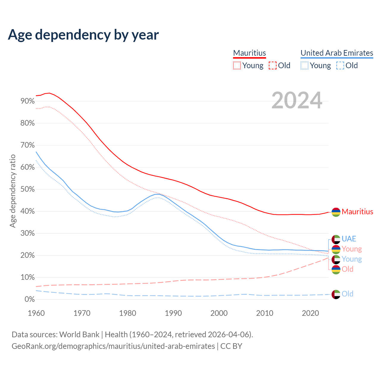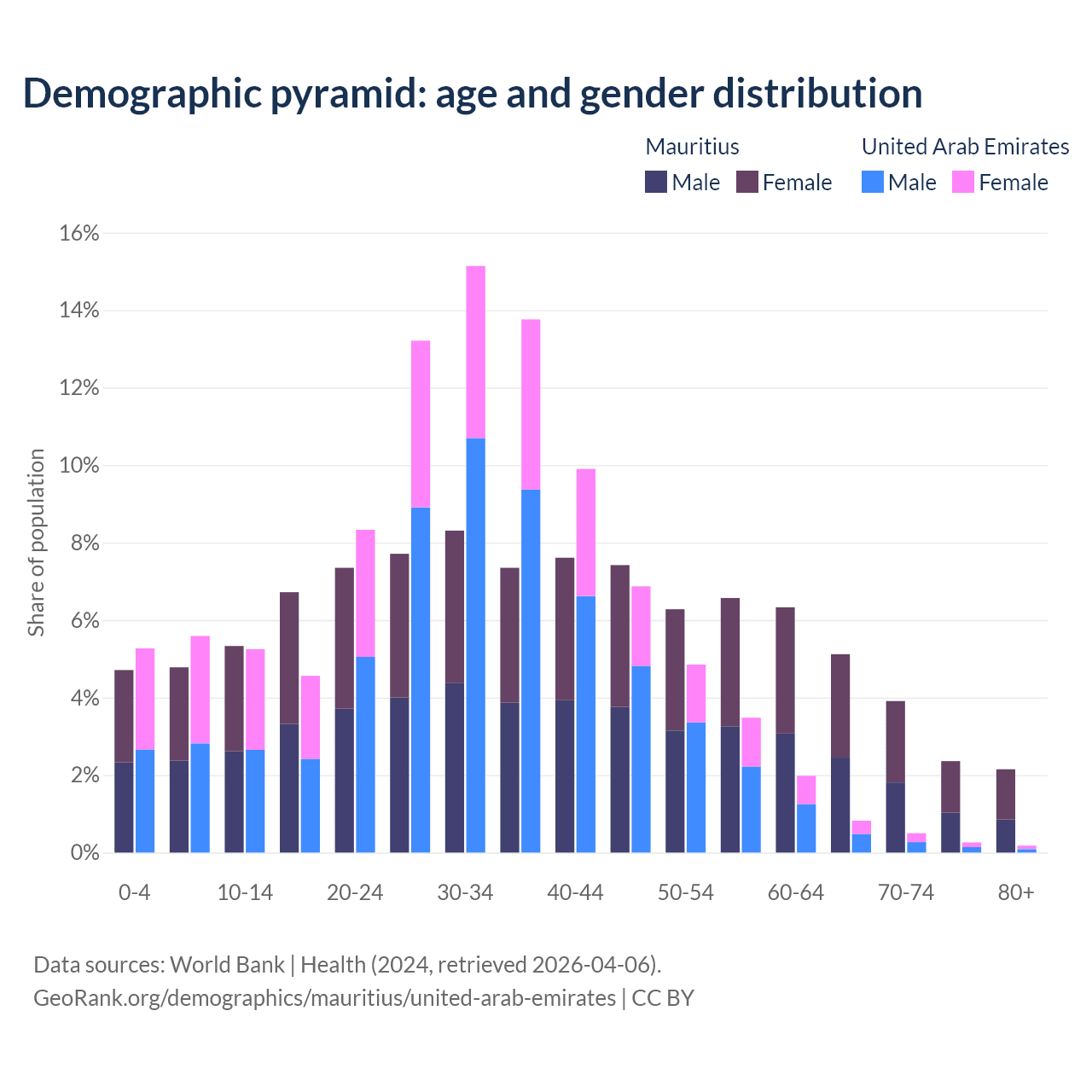- Mauritius is ranked 57/196 by median age (oldest to youngest) vs 91/196 for the United Arab Emirates.