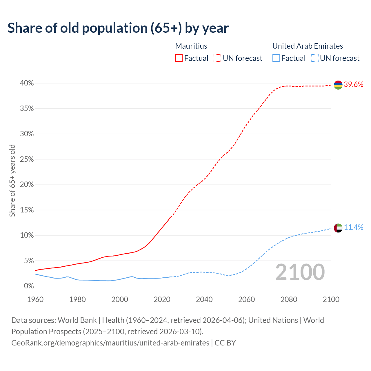 - The share of old-age demographic (65+) in Mauritius is 13.5% vs 1.77% in the United Arab Emirates.