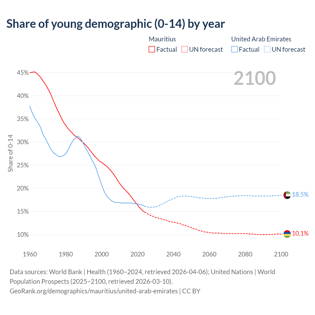 - The share of young demographic (0-15 years old) in Mauritius is 14.8% vs 16.1% in the United Arab Emirates.