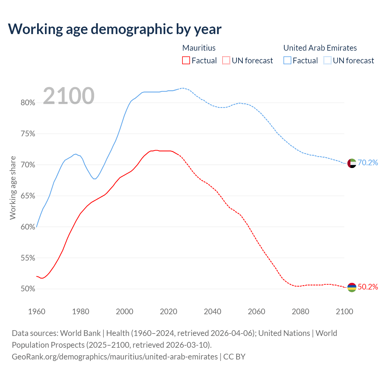 - Mauritius has 889K working age adults (aged 15-64) vs 9.6M in the United Arab Emirates.