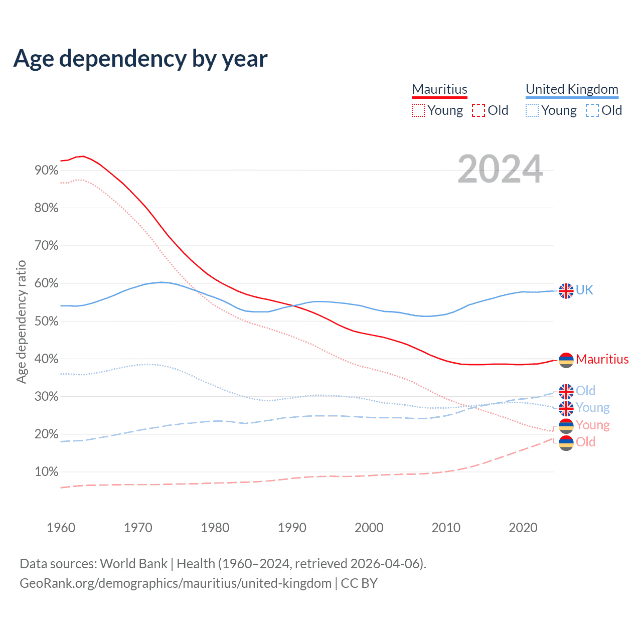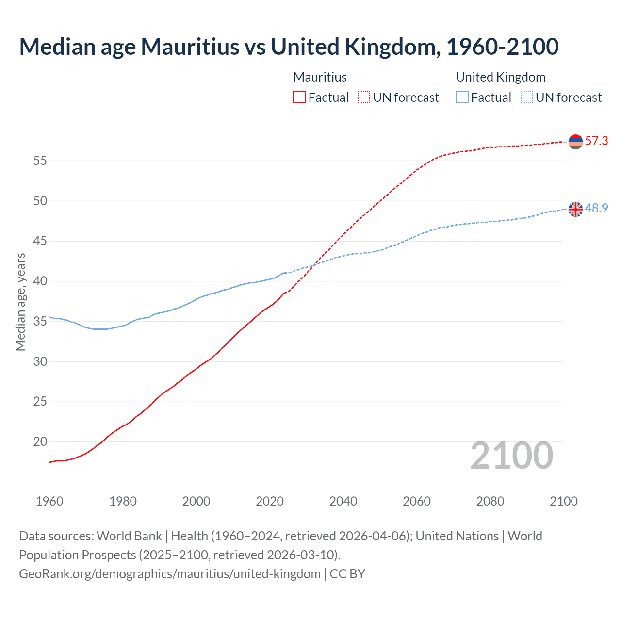 - The median age in Mauritius is 38.5 years compared to 41 years in the United Kingdom.