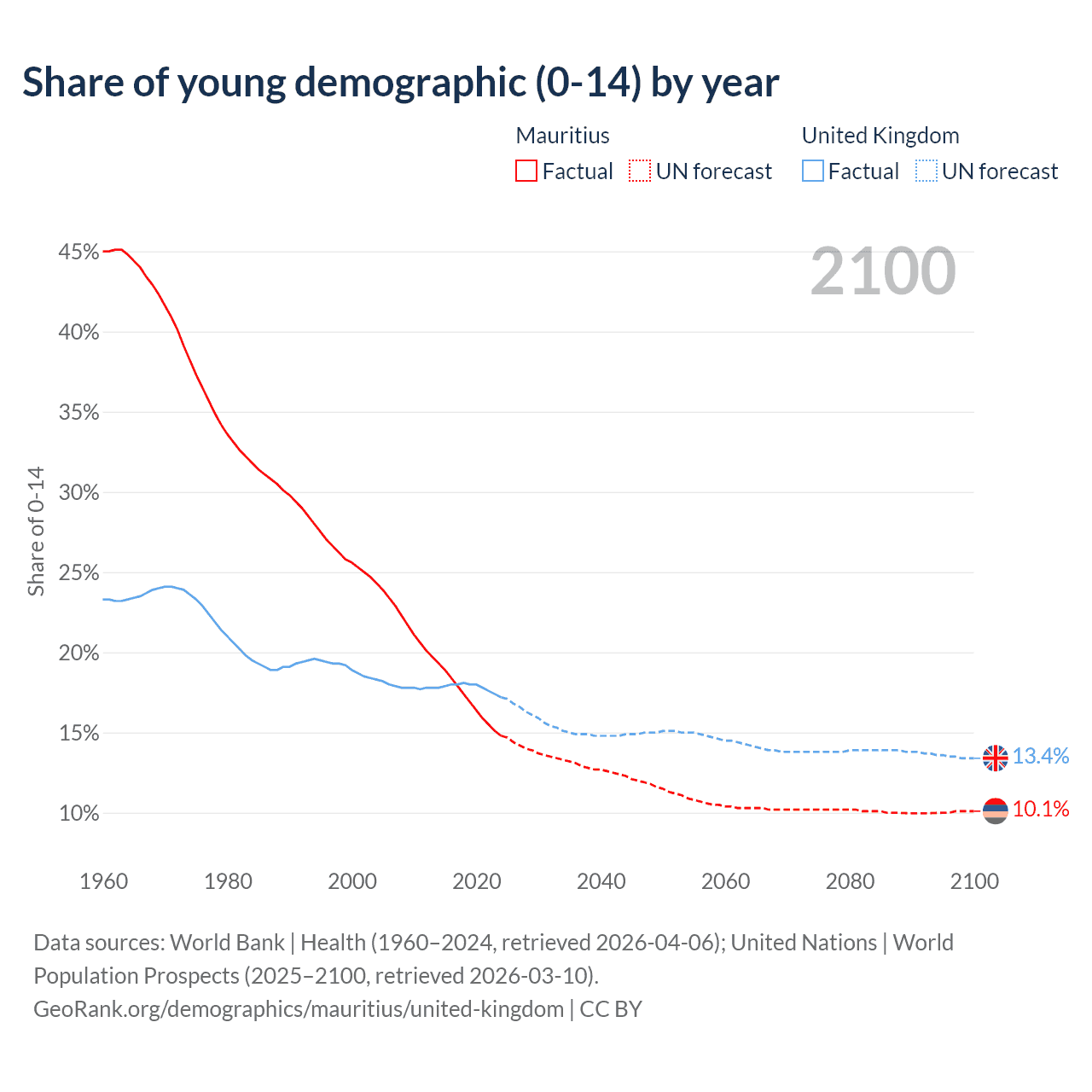 - The share of young demographic (0-15 years old) in Mauritius is 14.8% vs 17.2% in the United Kingdom.