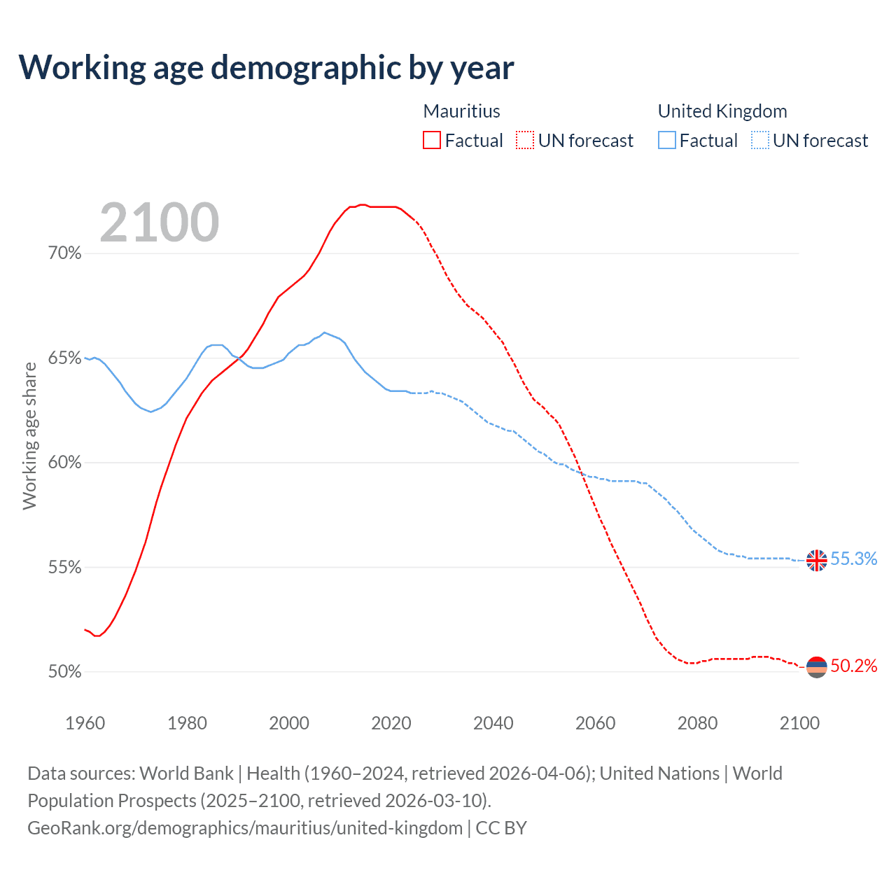 - Mauritius has 889K working age adults (aged 15-64) vs 44.4M in the United Kingdom.