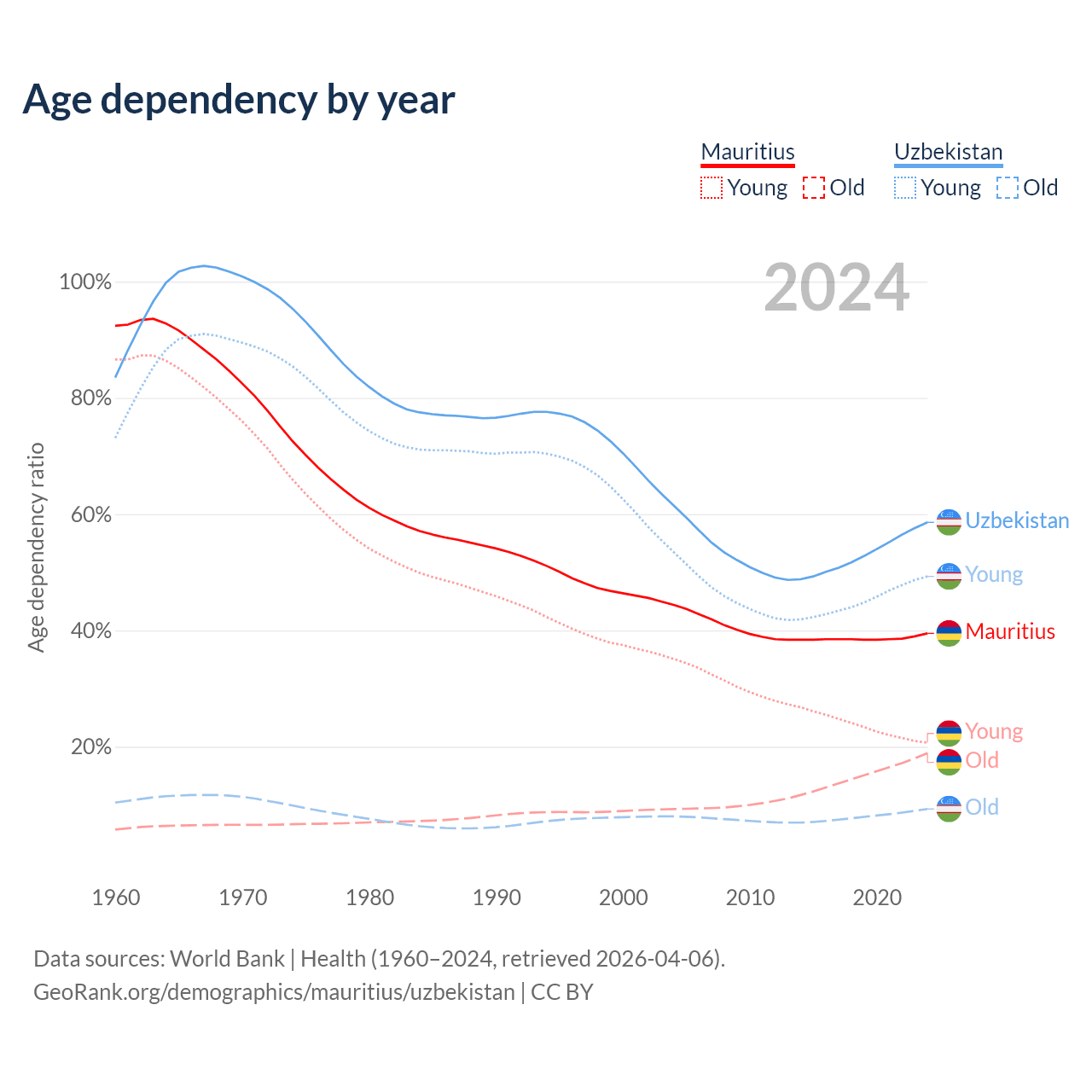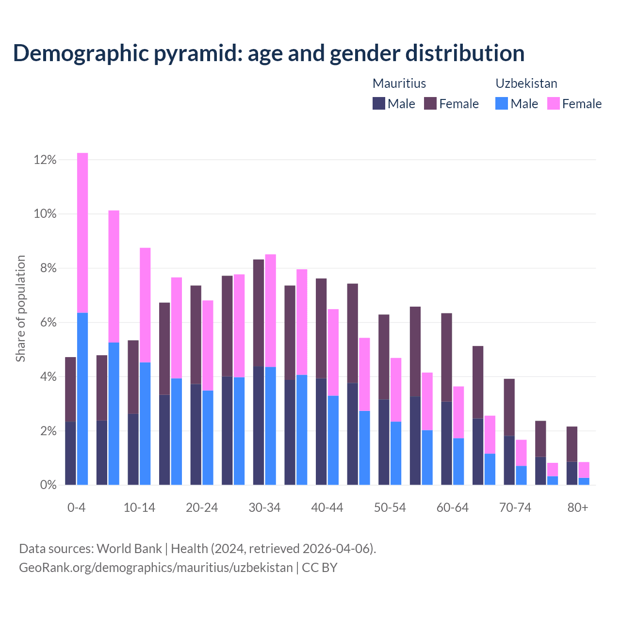 - Mauritius is ranked 57/196 by median age (oldest to youngest) vs 116/196 for Uzbekistan.