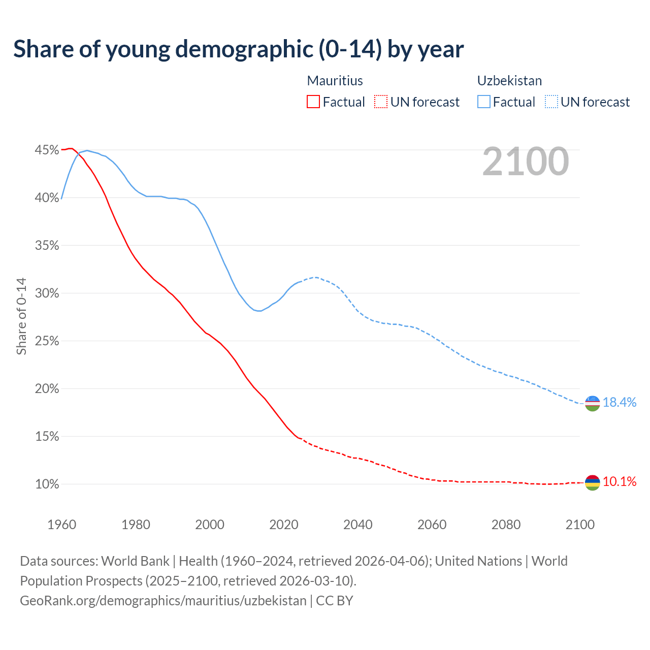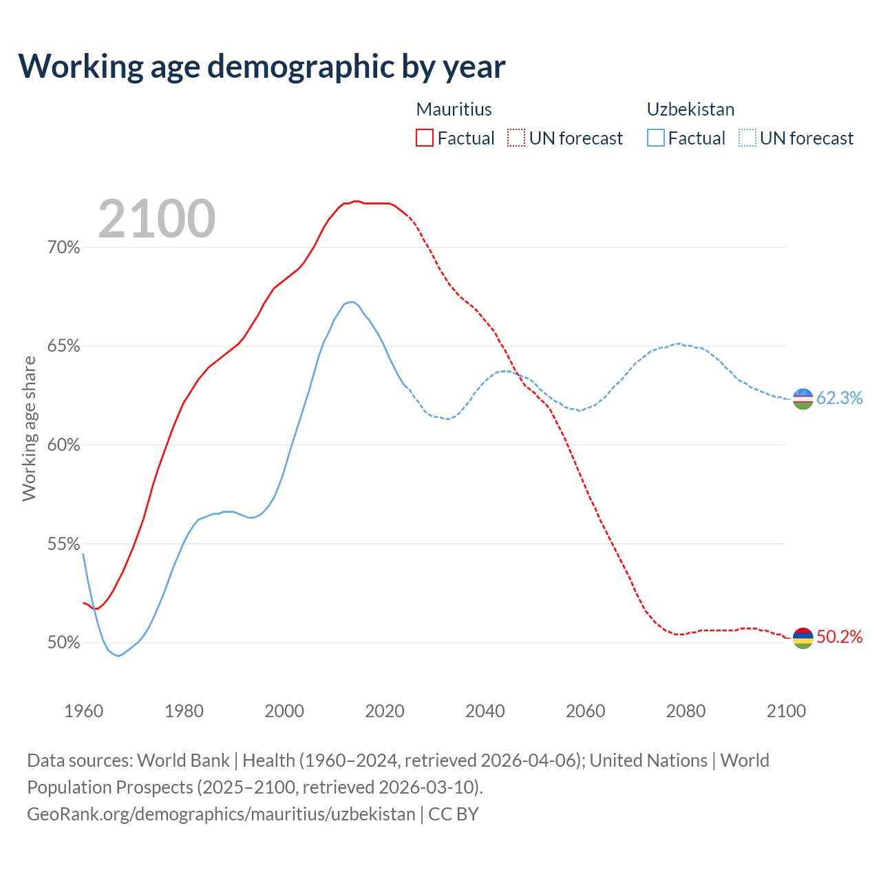 Median age Mauritius vs Uzbekistan, 1960-2100