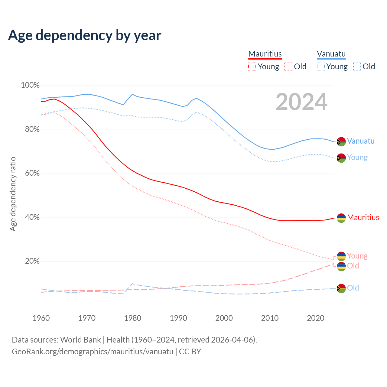 - Mauritius is ranked 57/196 by median age (oldest to youngest) vs 156/196 for Vanuatu.
