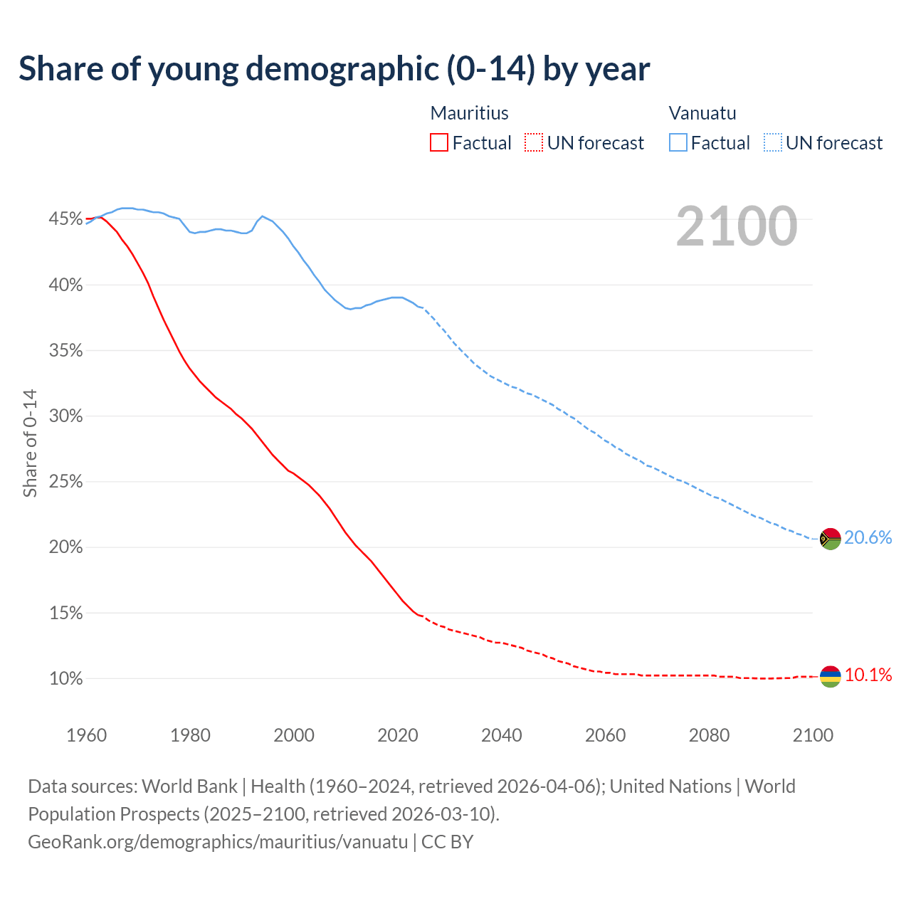 - The share of young demographic (0-15 years old) in Mauritius is 14.8% vs 38.3% in Vanuatu.
