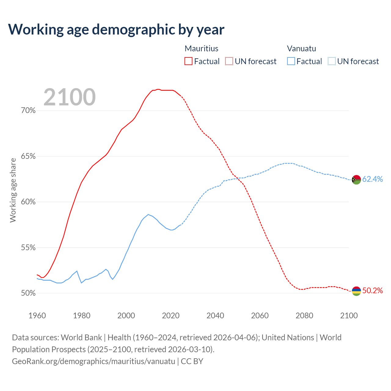 - Mauritius has 889K working age adults (aged 15-64) vs 198K in Vanuatu.