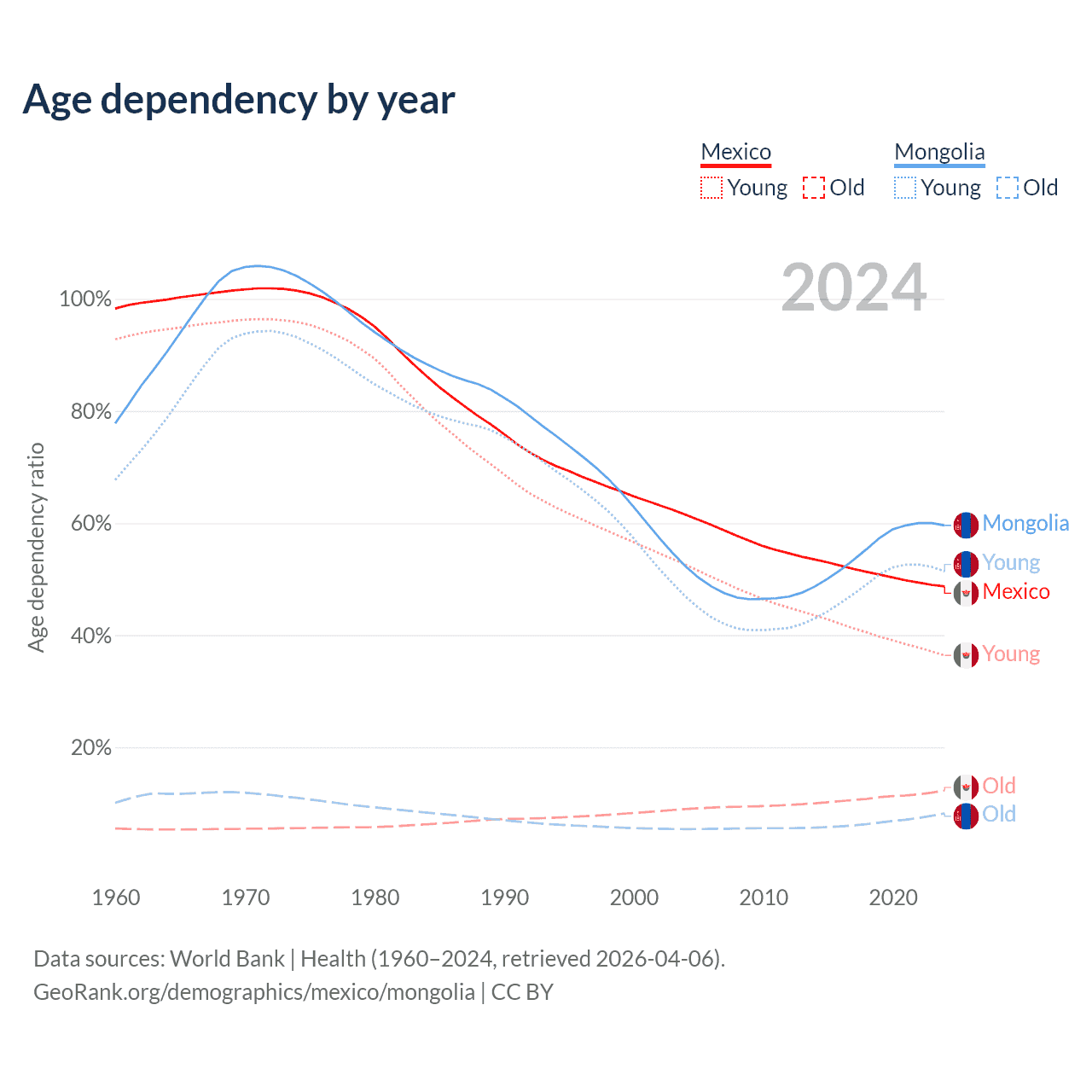 - Mexico is ranked 102/196 by median age (oldest to youngest) vs 117/196 for Mongolia.