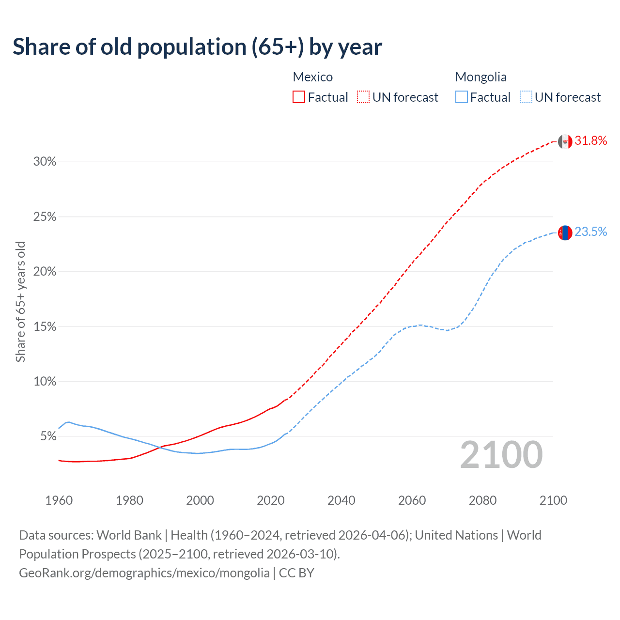 - The share of old-age demographic (65+) in Mexico is 8.25% vs 5.14% in Mongolia.
