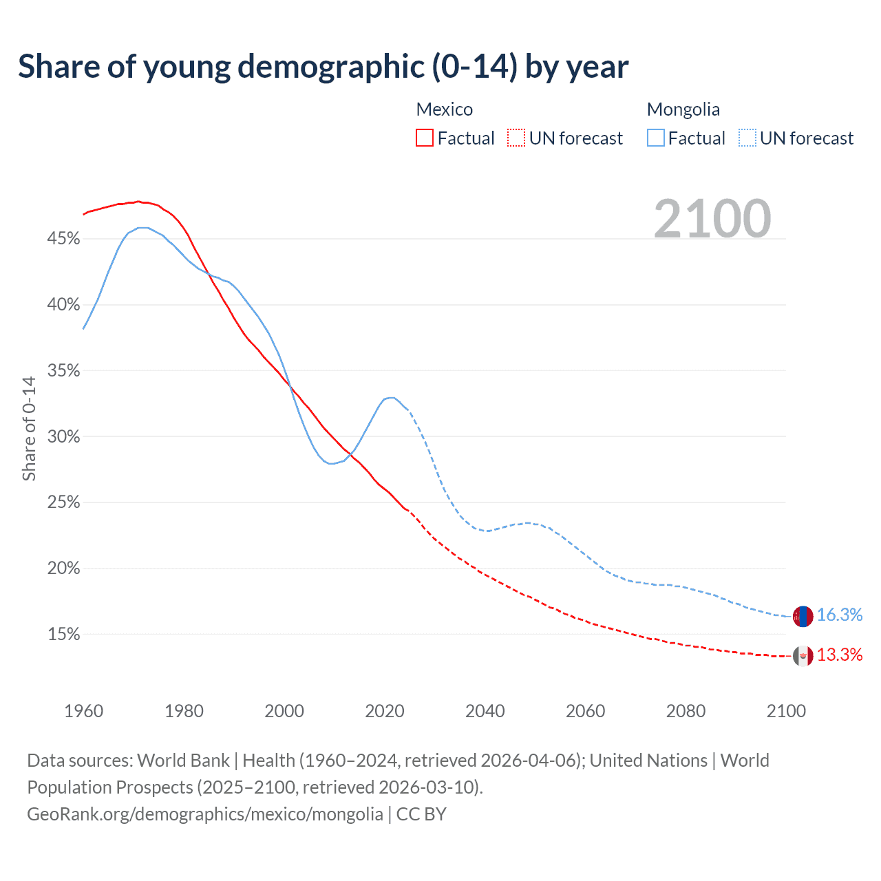 - The share of young demographic (0-15 years old) in Mexico is 24.5% vs 32.2% in Mongolia.