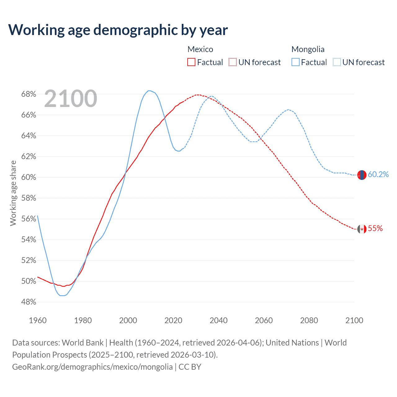- Mexico has 89.6M working age adults (aged 15-64) vs 2.27M in Mongolia.