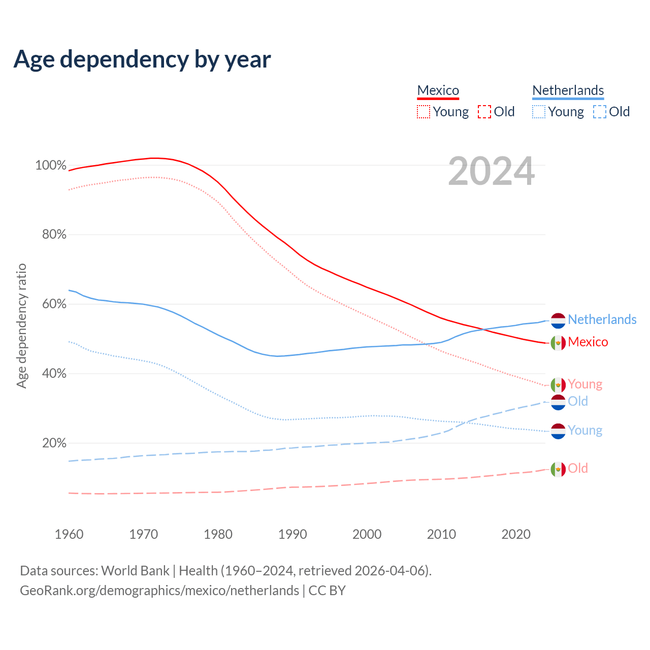 - Mexico is ranked 102/196 by median age (oldest to youngest) vs 33/196 for the Netherlands.