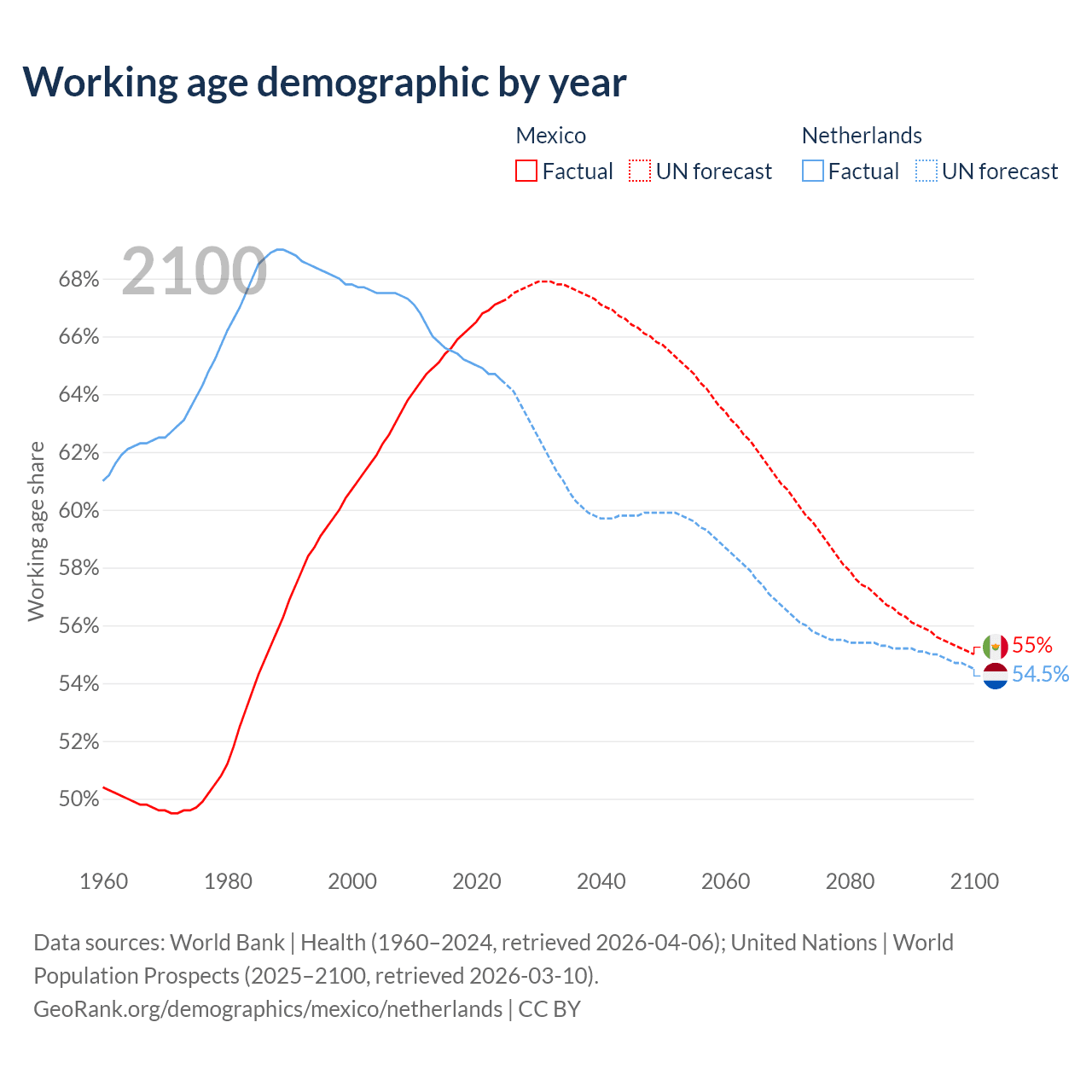Median age Mexico vs Netherlands, 1960-2100