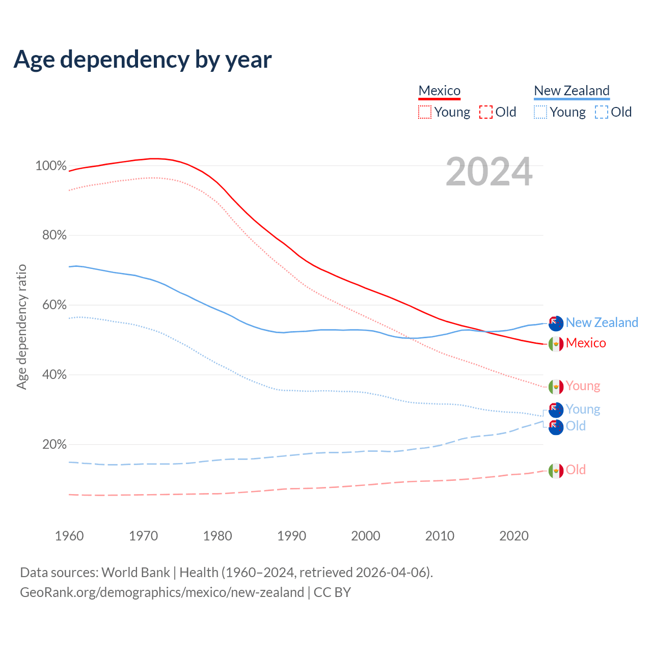 - Mexico is ranked 102/196 by median age (oldest to youngest) vs 56/196 for New Zealand.