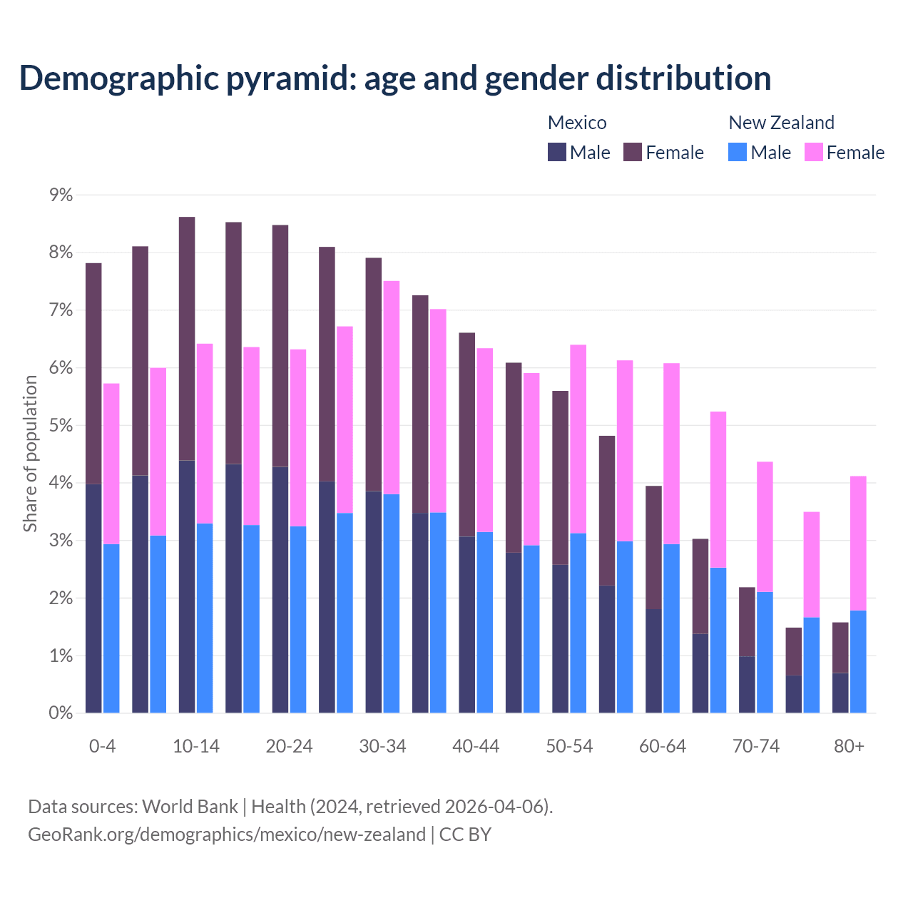 The share of older people aged 65 and over is 8.25% in Mexico and 17.2% in New Zealand. Life expectancy in Mexico compared to New Zealand .