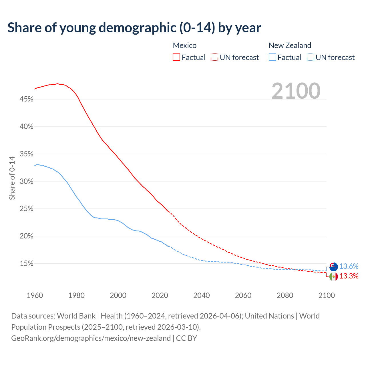 - The share of young demographic (0-15 years old) in Mexico is 24.5% vs 18.1% in New Zealand.