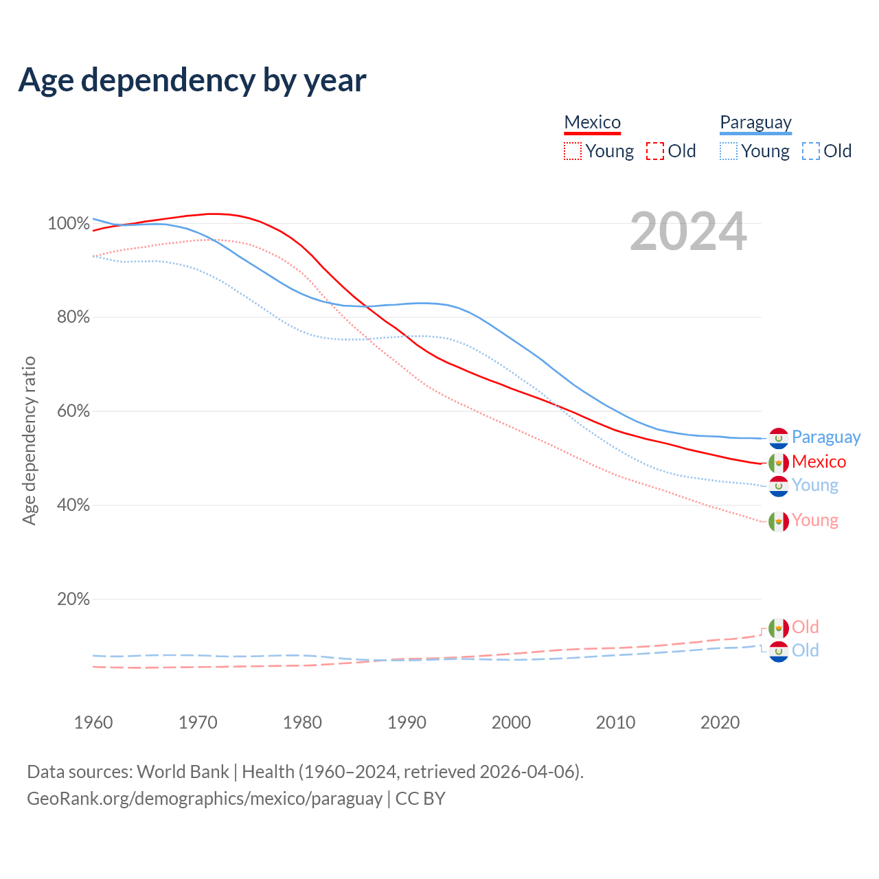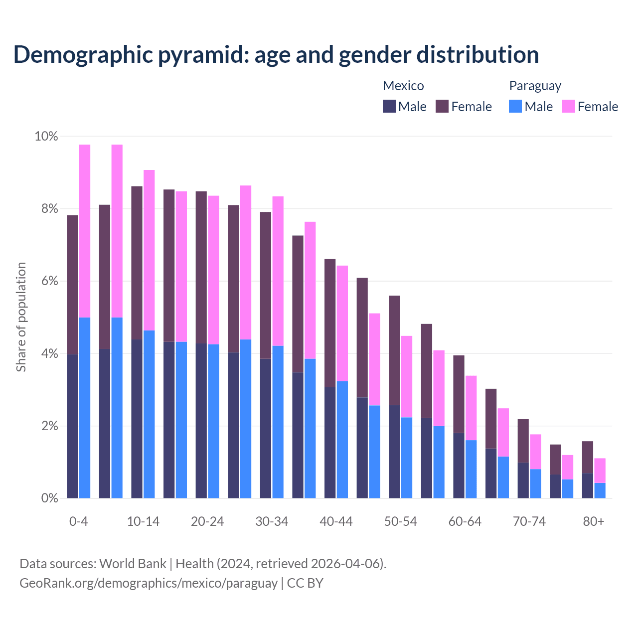 - Mexico is ranked 102/196 by median age (oldest to youngest) vs 118/196 for Paraguay.