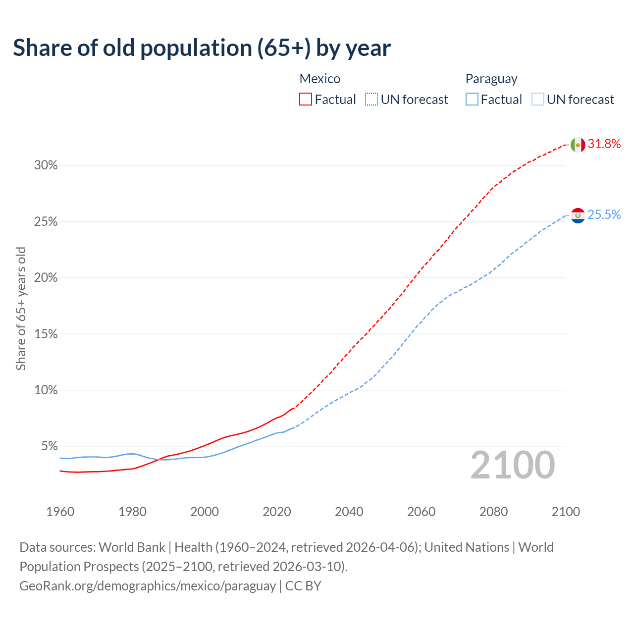 The share of older people aged 65 and over is 8.25% in Mexico and 6.54% in Paraguay. Life expectancy in Mexico compared to Paraguay .