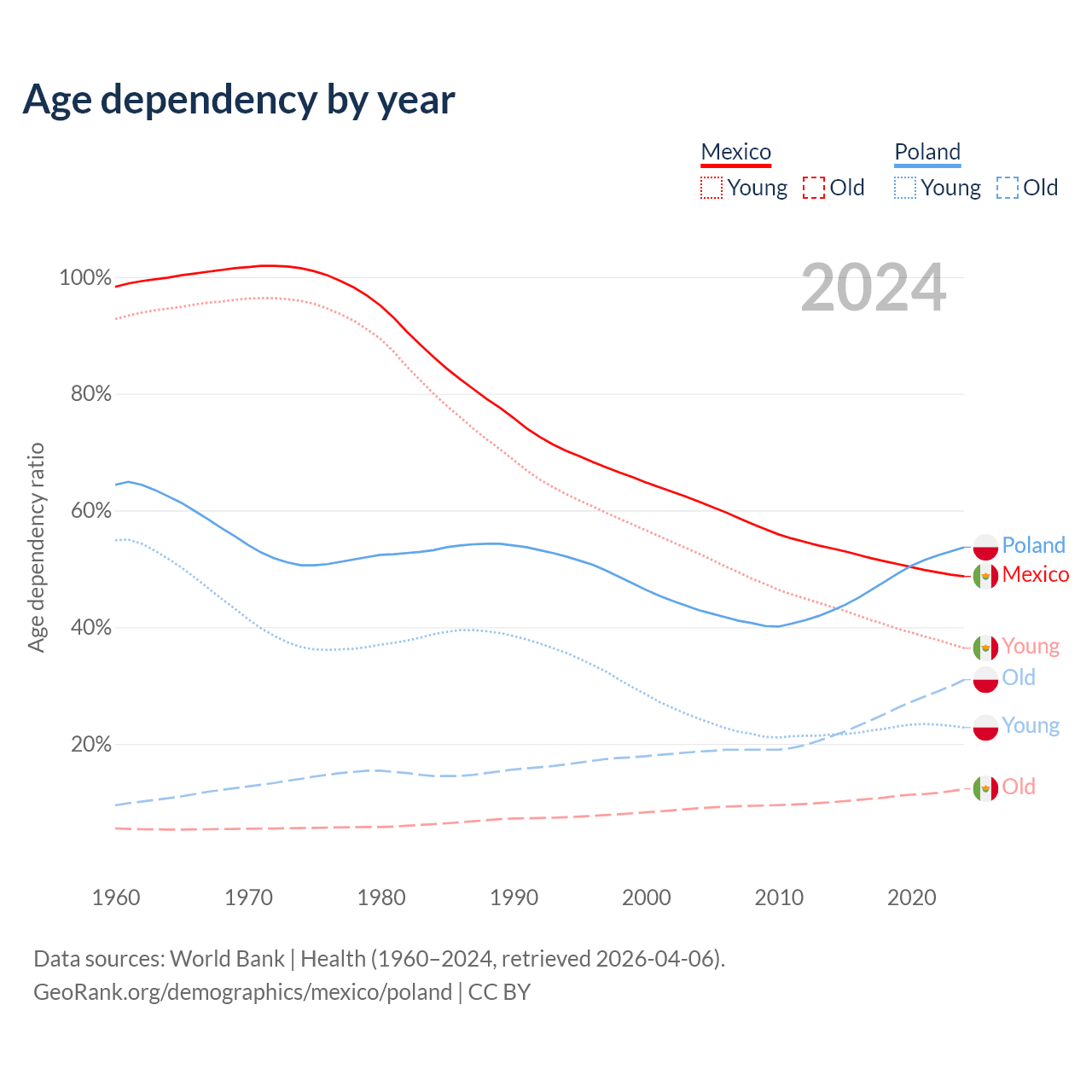 The share of older people aged 65 and over is 8.25% in Mexico and 20.1% in Poland. Life expectancy in Mexico compared to Poland .