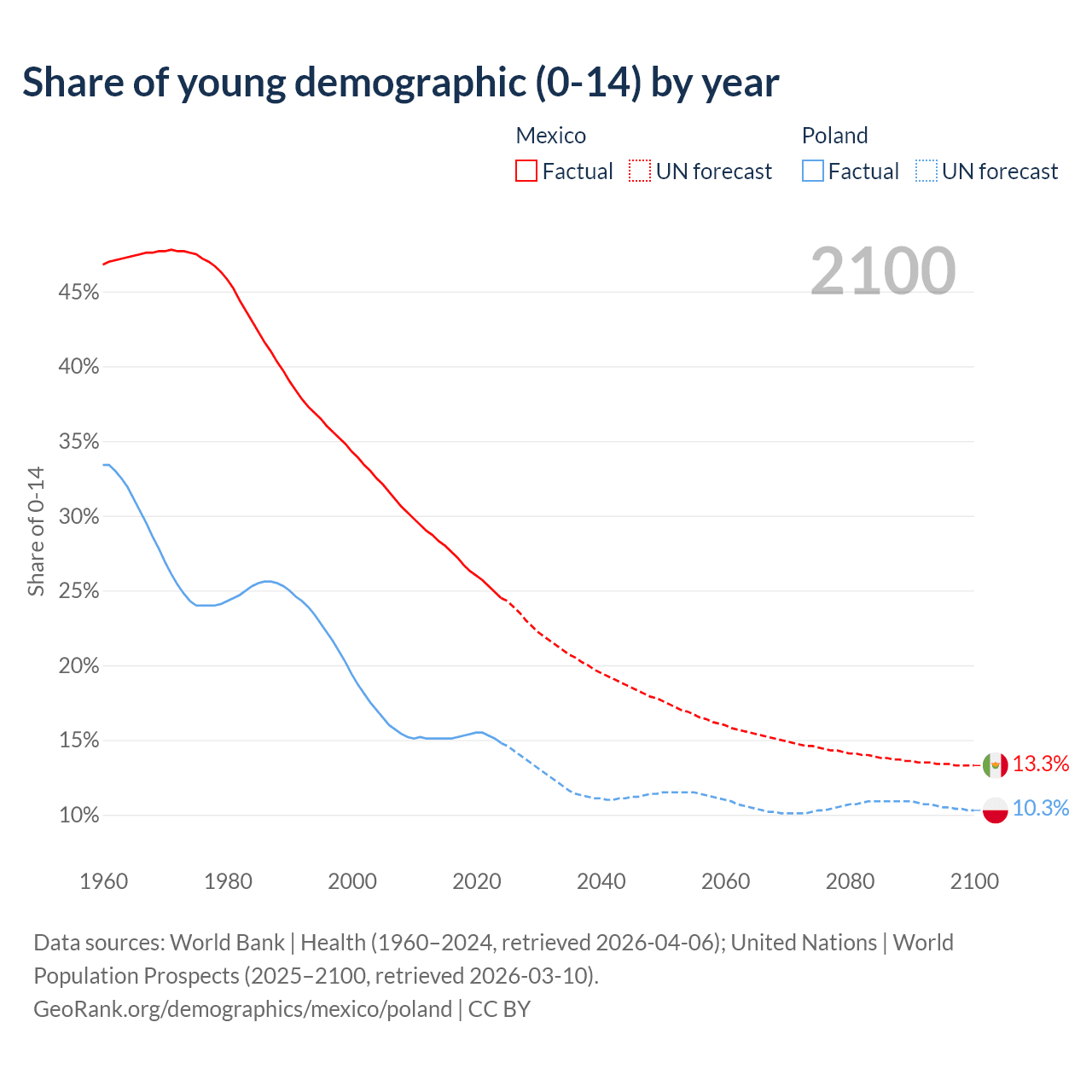 - The share of young demographic (0-15 years old) in Mexico is 24.5% vs 14.8% in Poland.