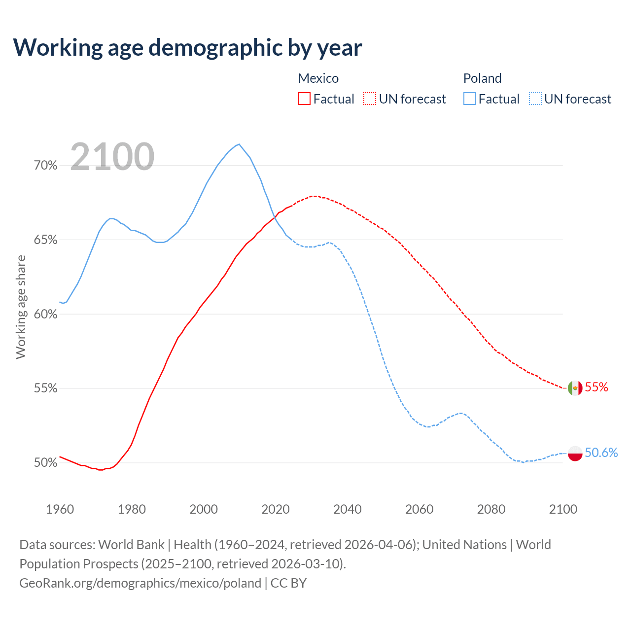 Median age Mexico vs Poland, 1960-2100