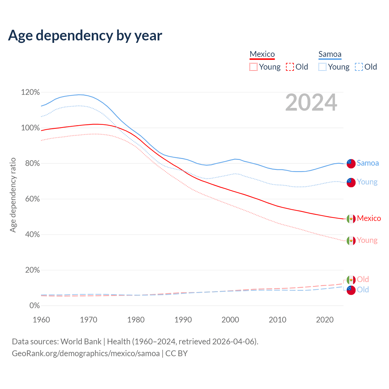 Data sources: World Bank | Health (1960–2024, retrieved 2026-04-06); U.S. Census Bureau (1960–2024, retrieved 2026-02-08).