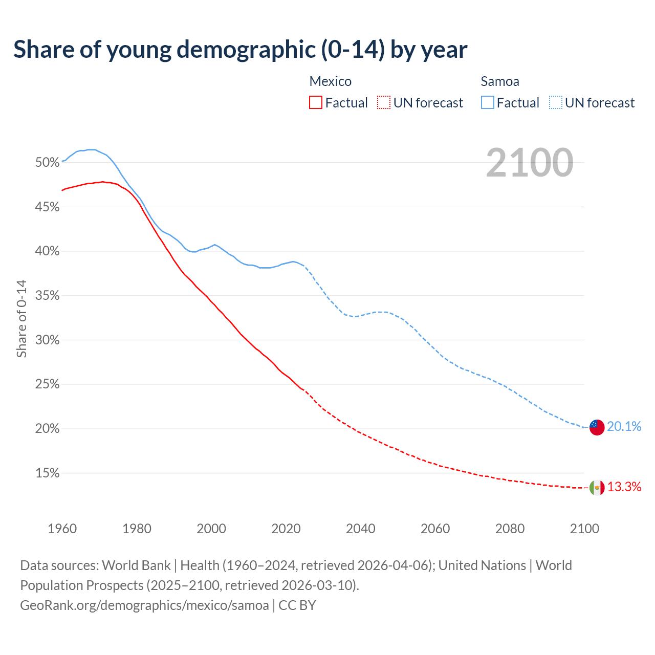 - The share of young demographic (0-15 years old) in Mexico is 24.5% vs 38.5% in Samoa.