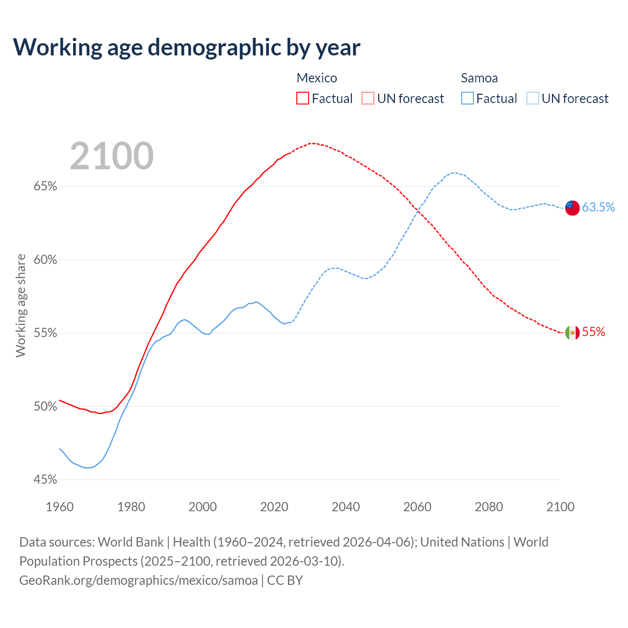 - Mexico has 89.6M working age adults (aged 15-64) vs 123K in Samoa.