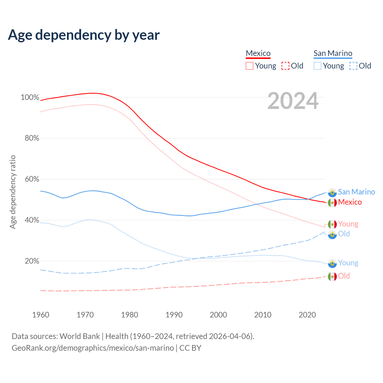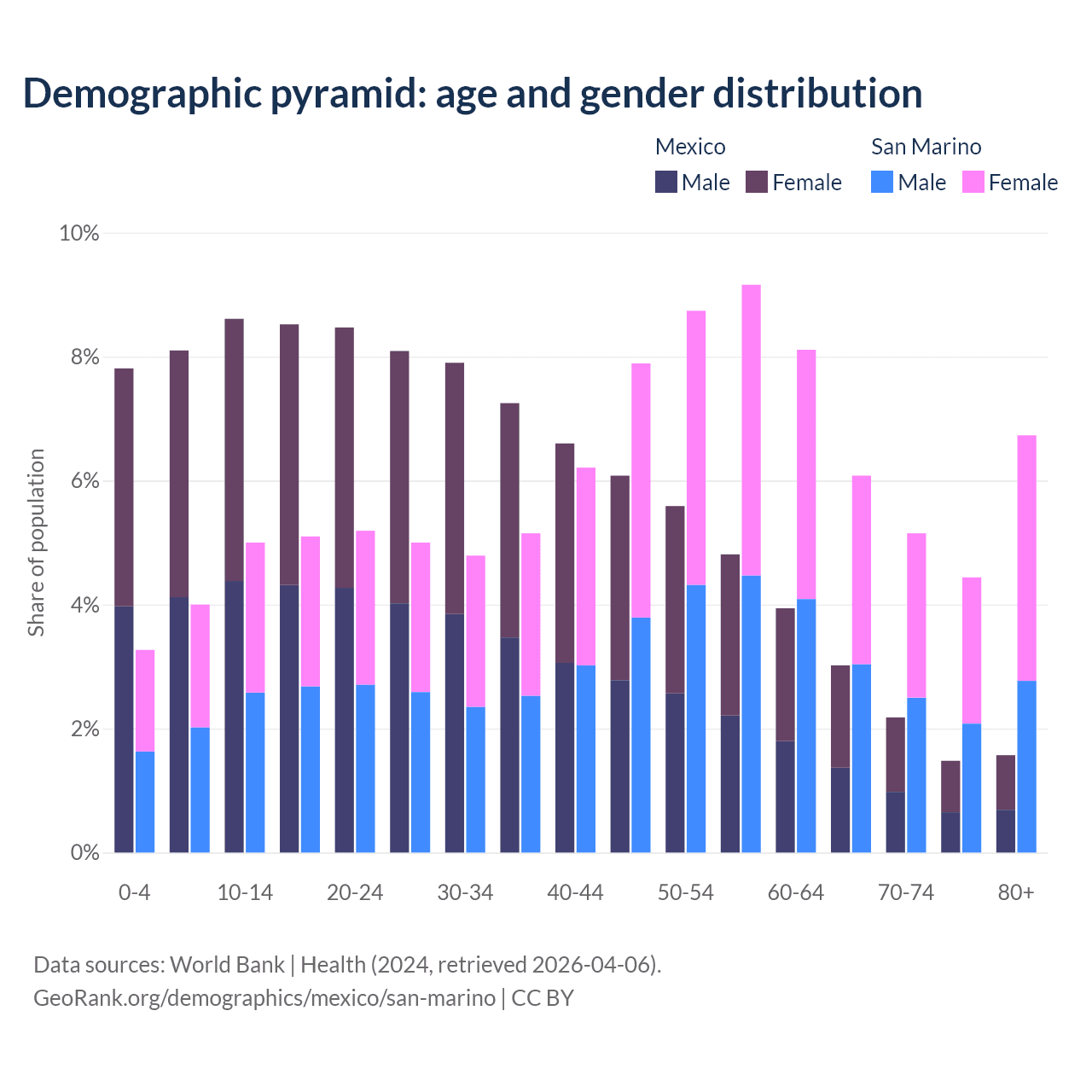 - Mexico is ranked 102/196 by median age (oldest to youngest) vs 3/196 for San Marino.