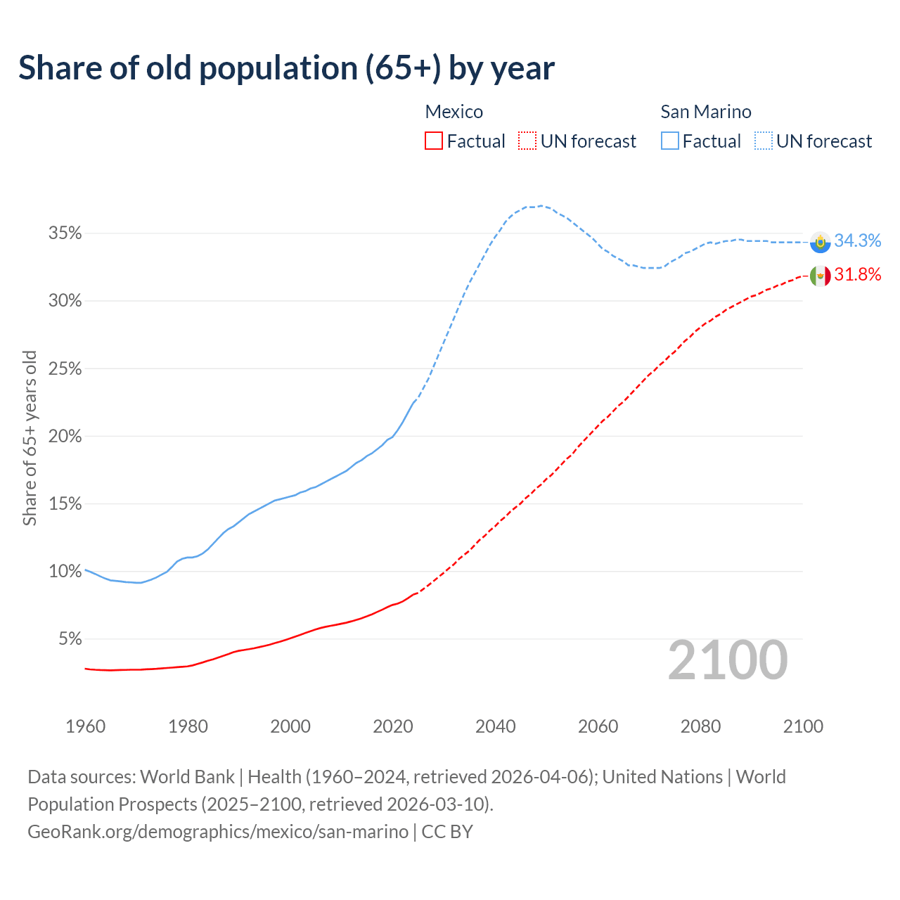 - The share of old-age demographic (65+) in Mexico is 8.25% vs 22.4% in San Marino.