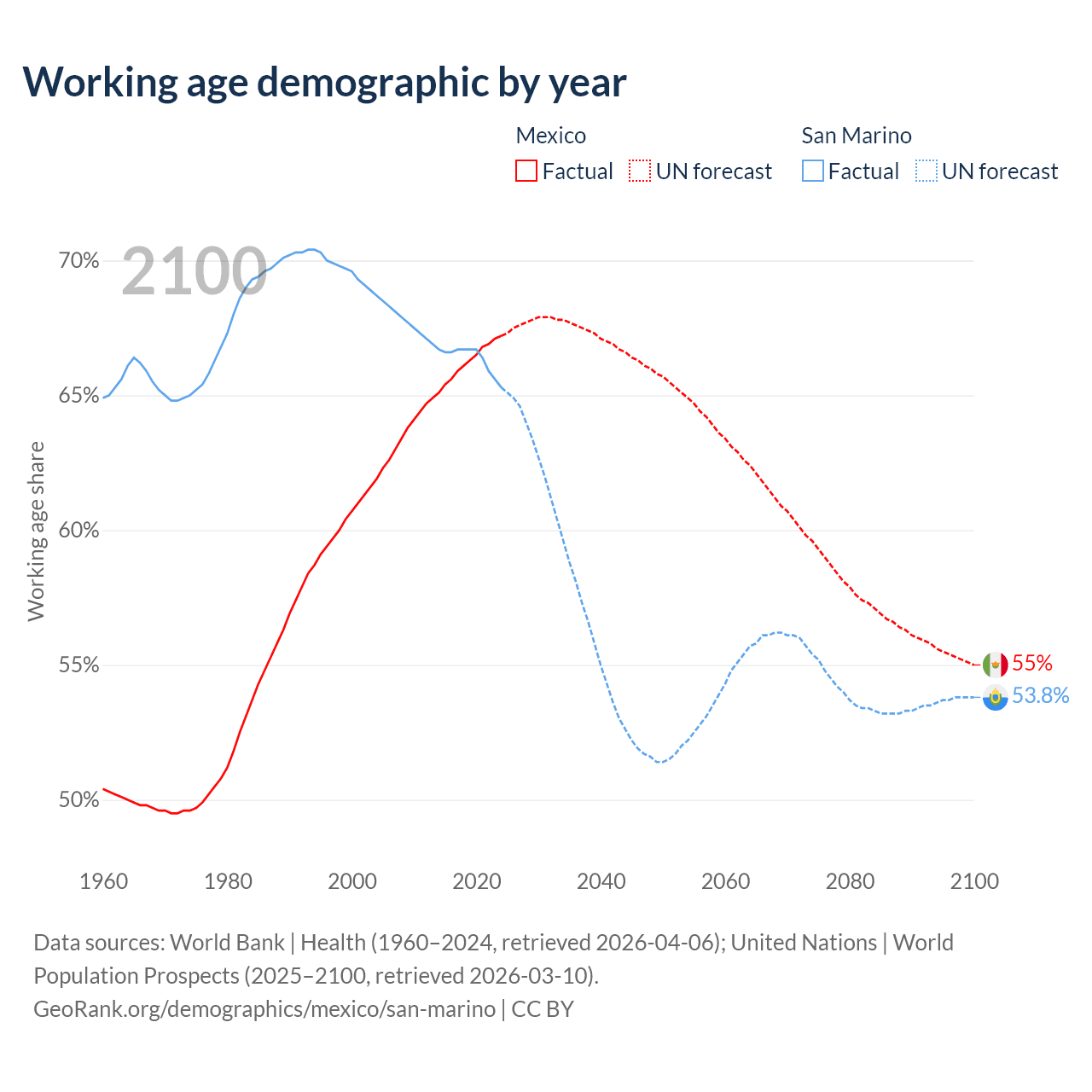 - Mexico has 89.6M working age adults (aged 15-64) vs 22.2K in San Marino.