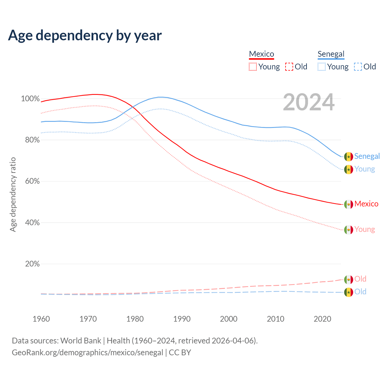 - Mexico is ranked 102/196 by median age (oldest to youngest) vs 162/196 for Senegal.